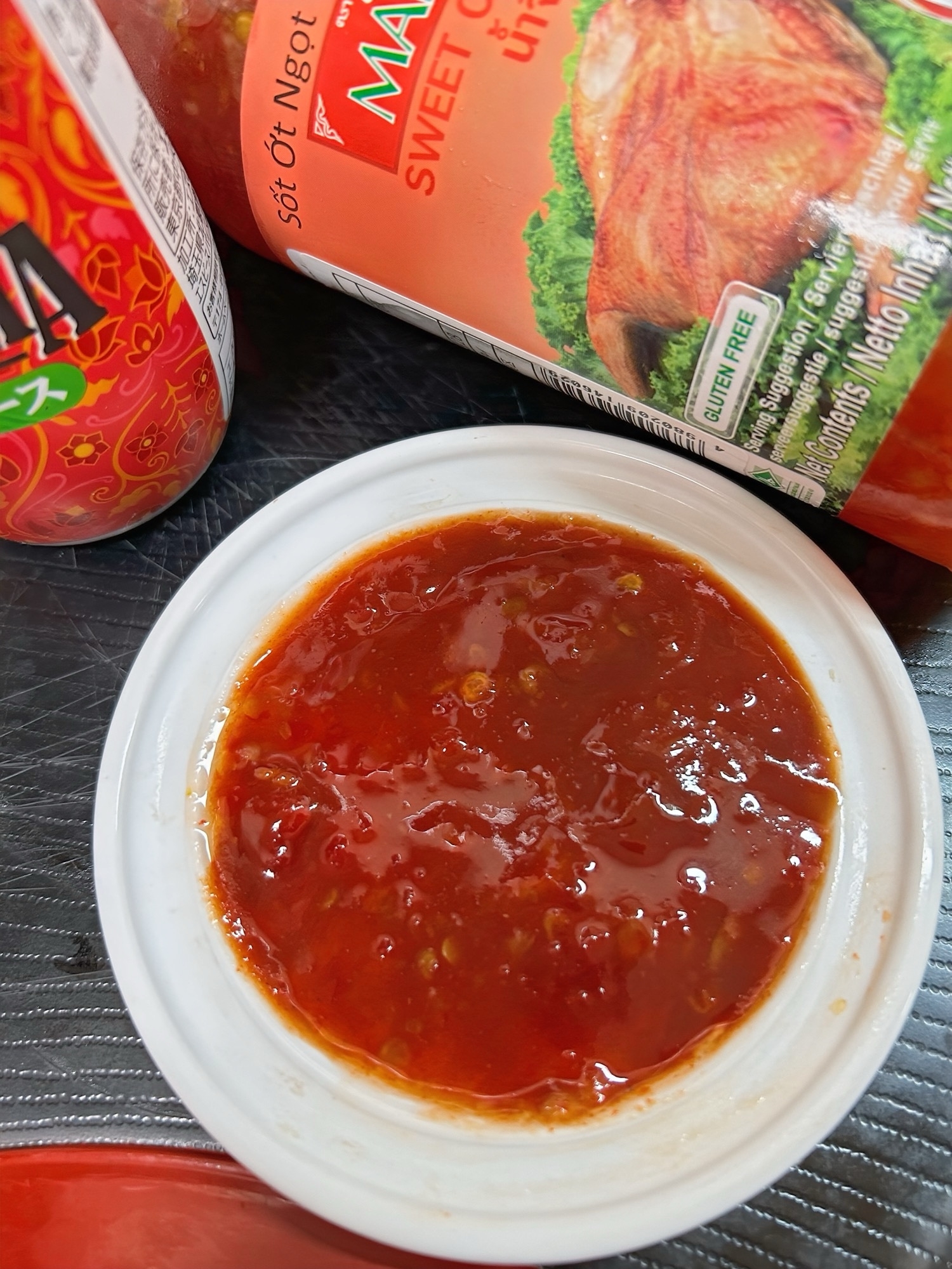 タレをつくっておきます。スイートチリソース(ナムチムガイ)だけでも、一段辛いシラチャーソースを混ぜても、そこにケチャップでまろやかにしてもOKです。