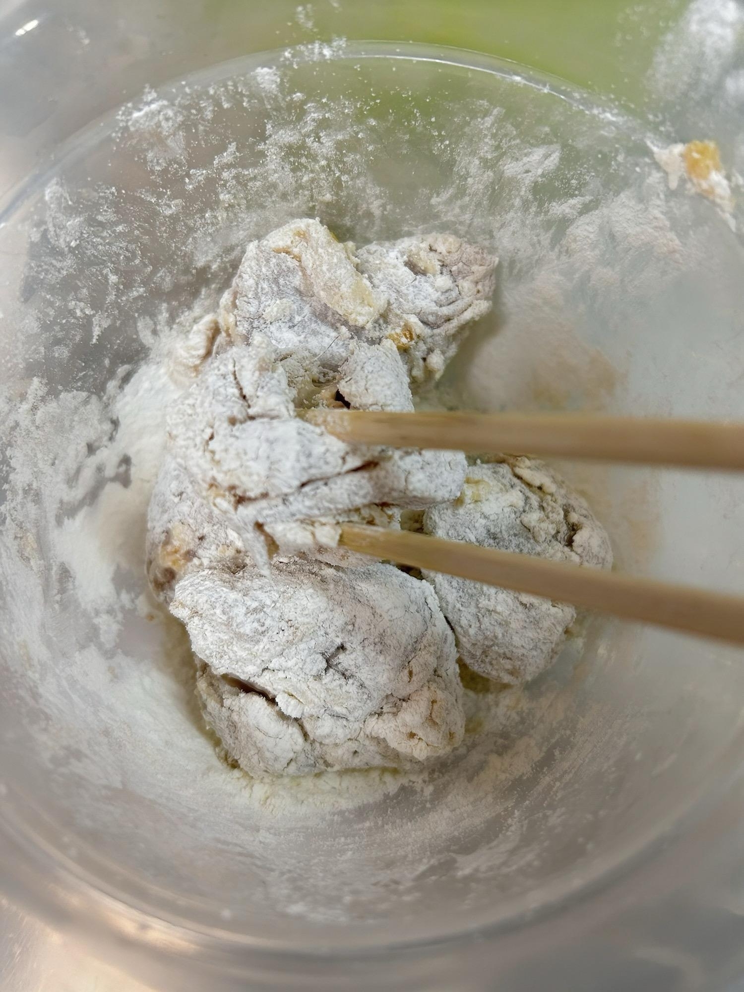 ボールに鶏肉を移して小麦粉などの粉をしっかりまぶします。