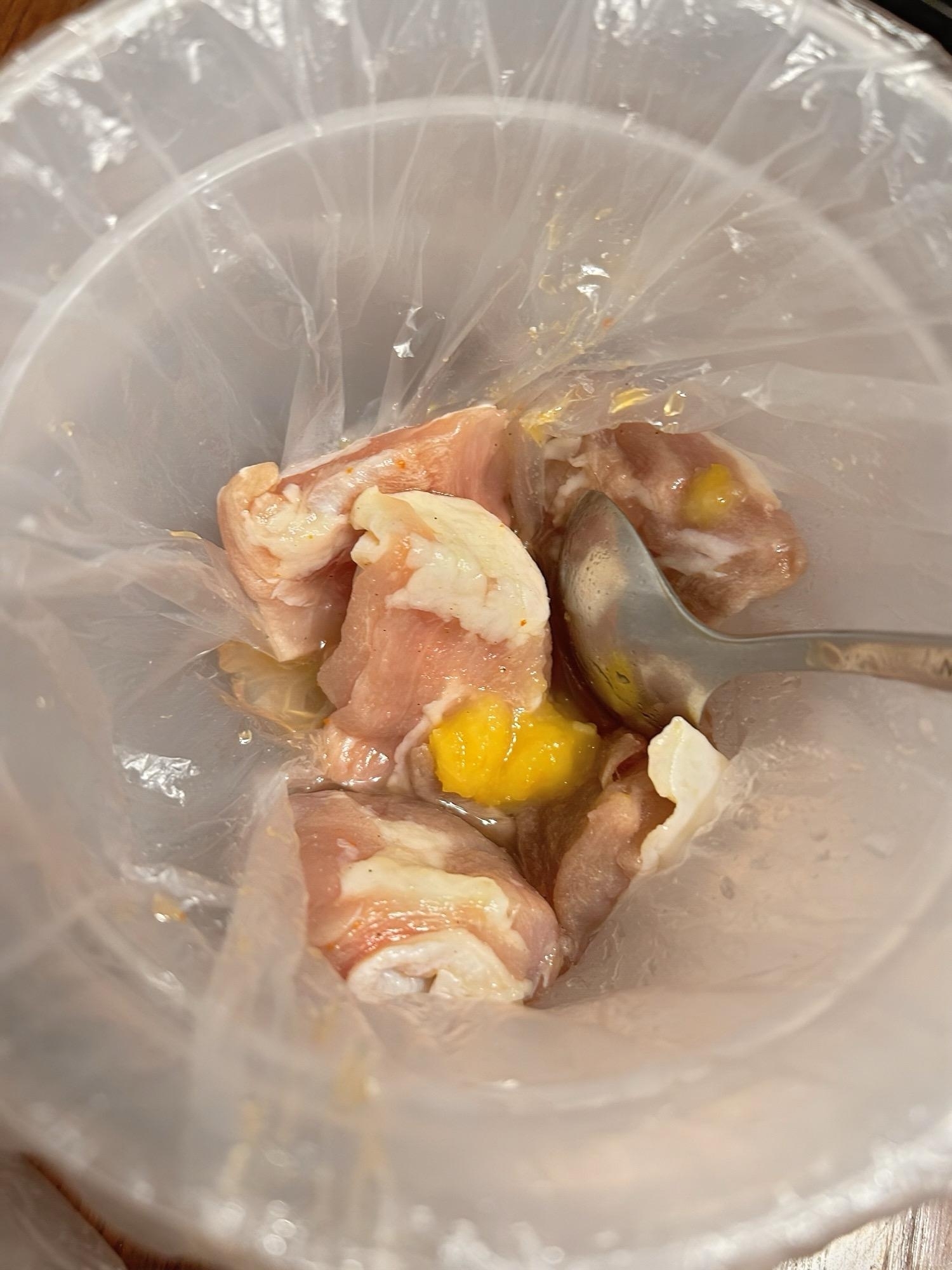 ポリ袋に肉と唐揚げの素(漬け込みタレ)、チューブ刻み柚子を入れます。唐揚げの素の量は肉の量に対して各メーカーの説明書きに合わせてください。