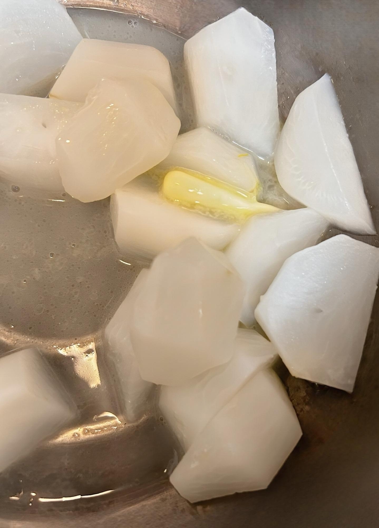 鍋に蕪と水、塩、砂糖を入れて火にかけます。