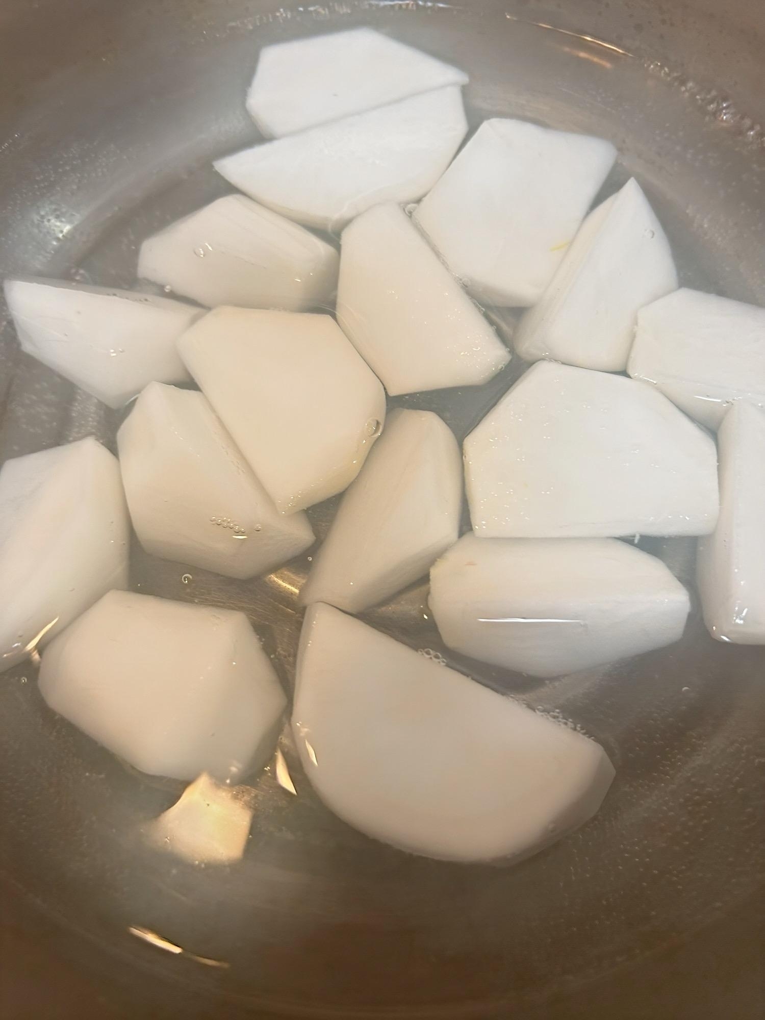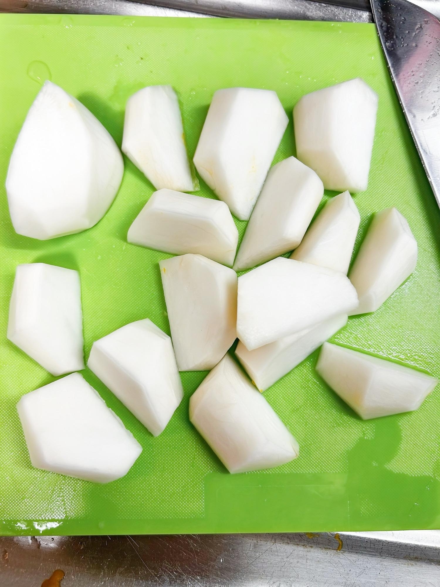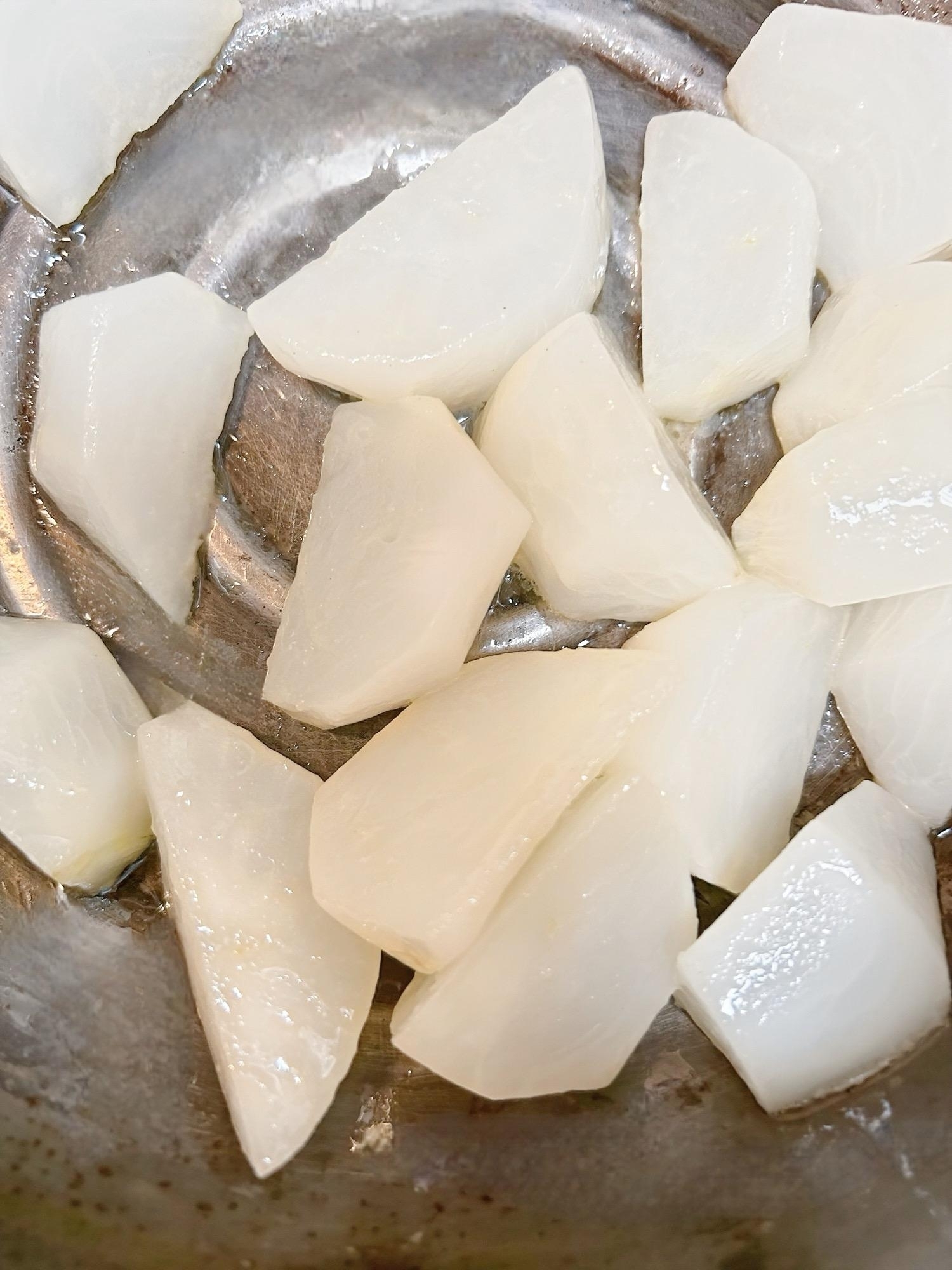 蕪は皮を剥いて6つ割りか4つ割に切ります。今回6つ割で小さいので面取りしませんでしたが、4つ割の場合は面取りしてもOKです。
