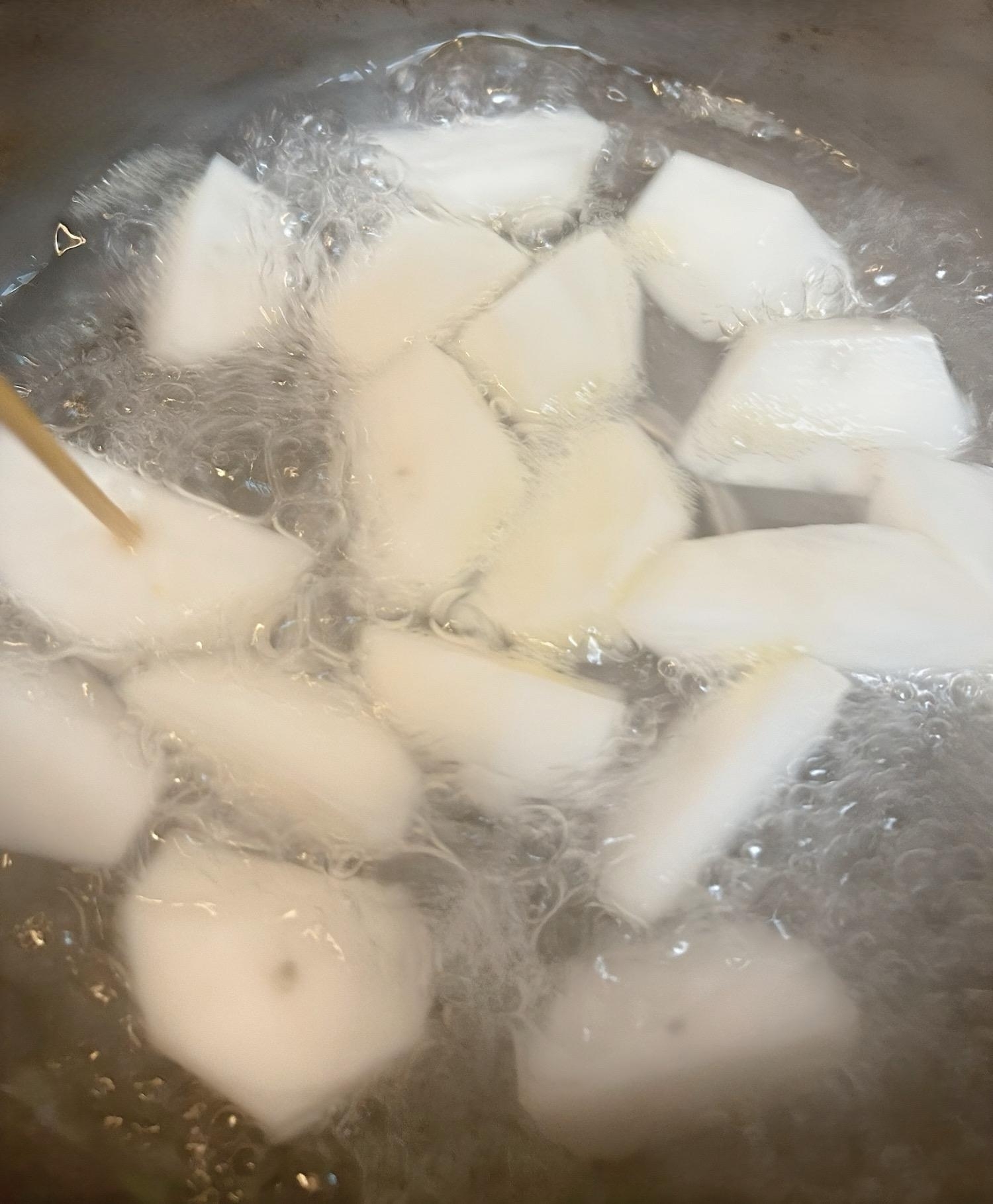 しばらく煮て、竹串などを刺してみて楽に通ったら一旦火からおろします。ここで鍋の水分を捨てますが、完全に水分が切れていなくても少し残っていても大丈夫です。