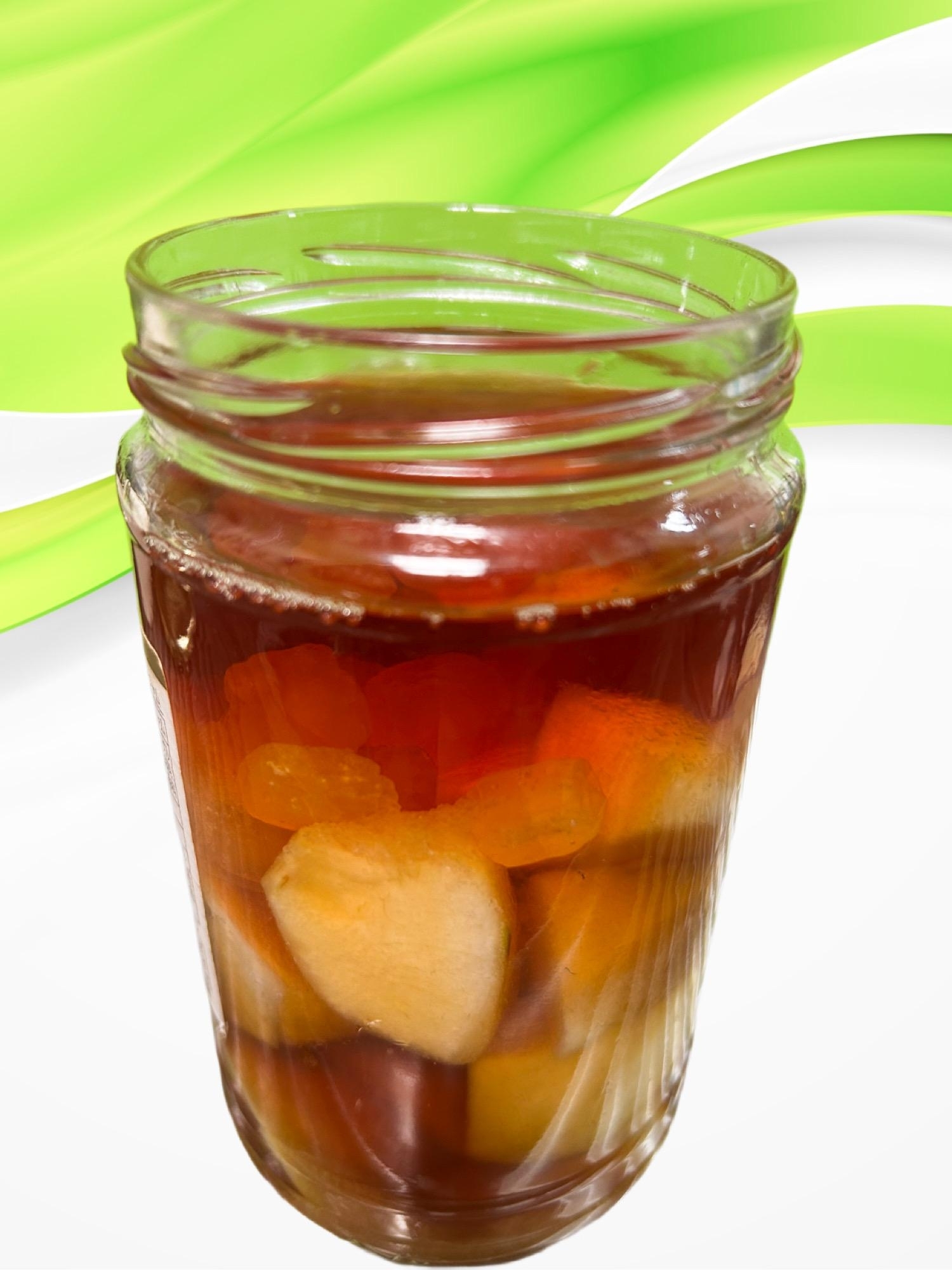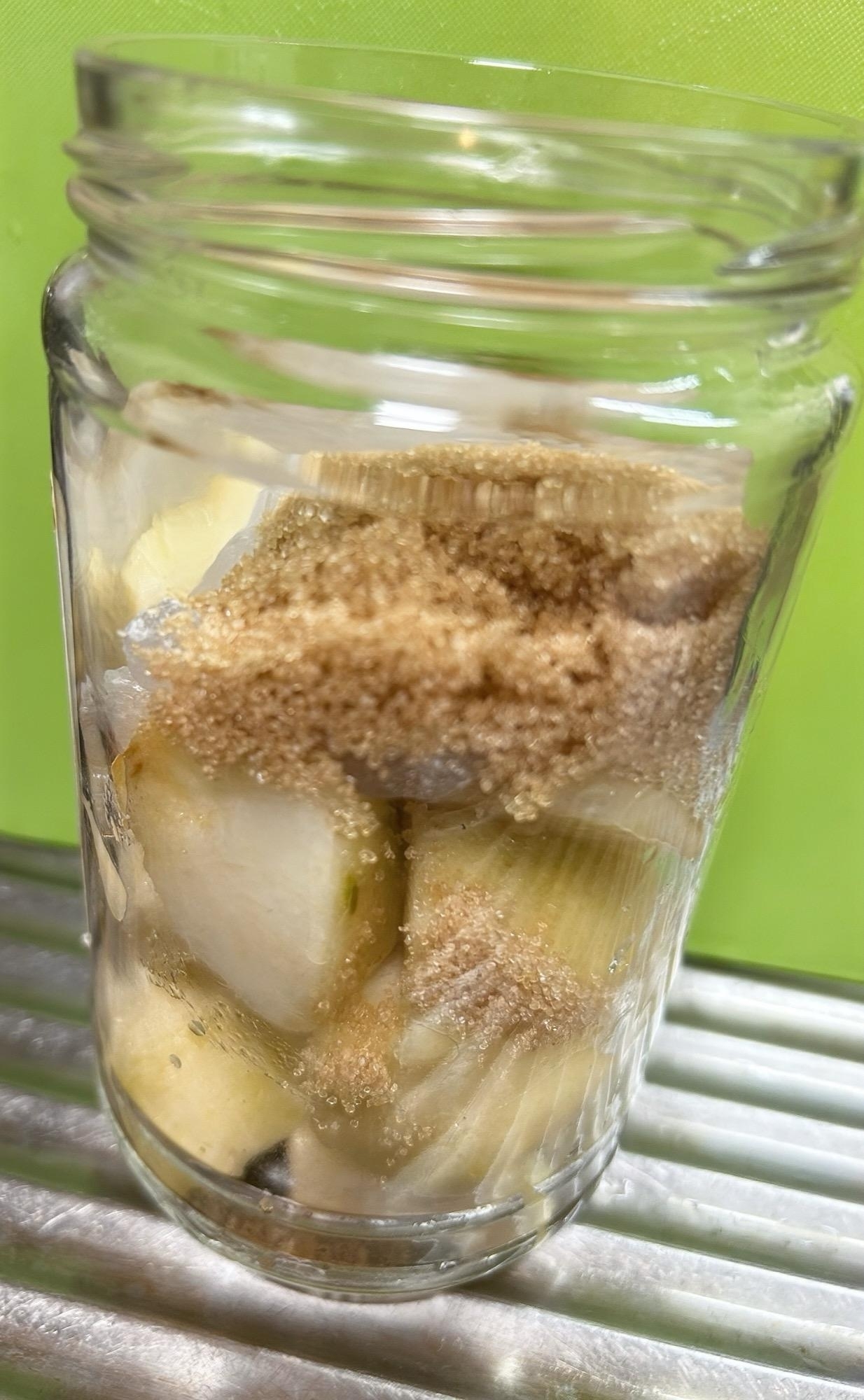 予め煮沸消毒した瓶にラフランスを切ったもの、氷砂糖、ブラウンシュガーを入れます。
