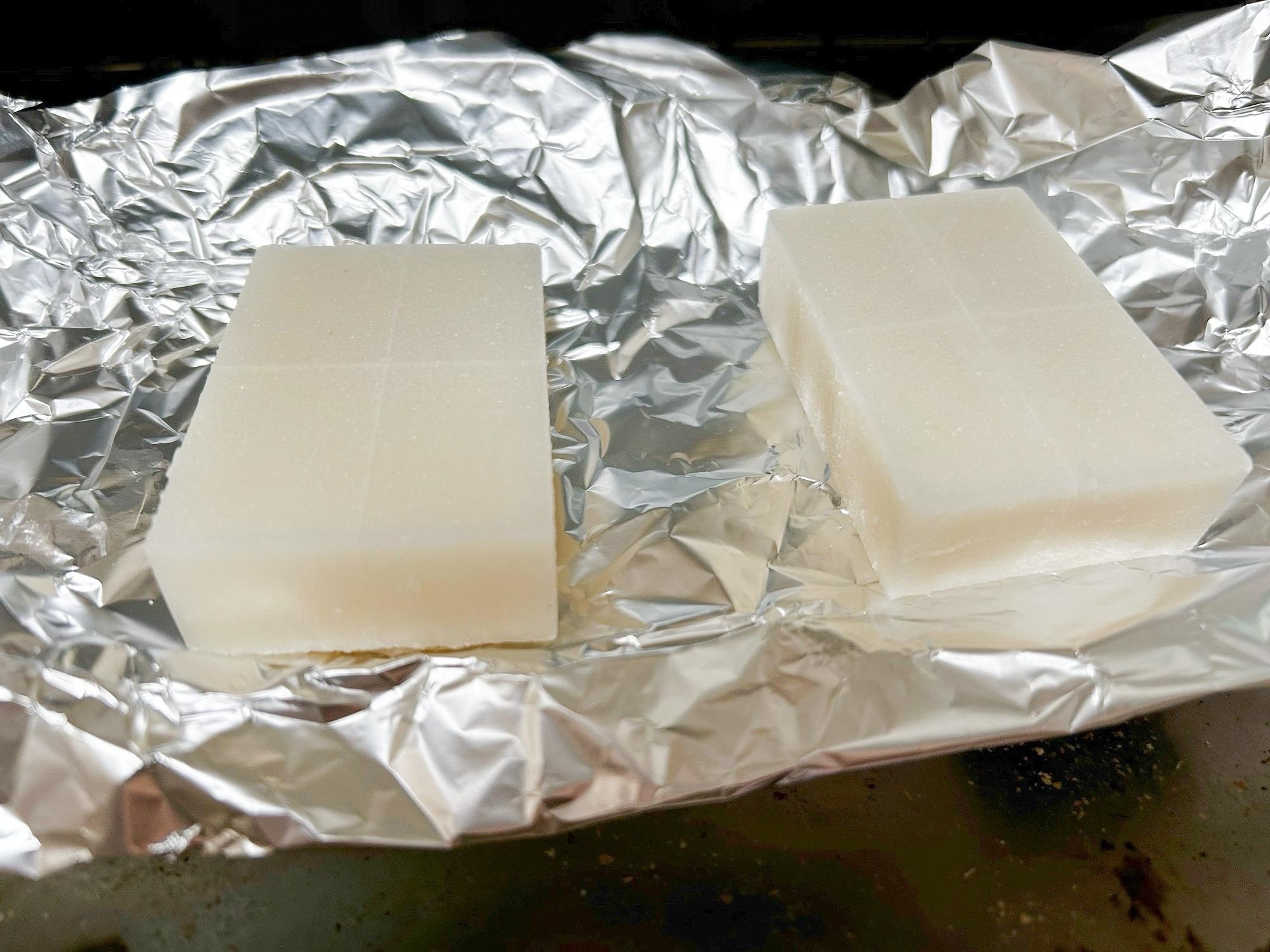 キツネ揚げは食べやすく切っておきます。餅が焼けたタイミングで丼にきしめんの麺を移し、まずきつね揚げを乗せます。上から熱々に再加熱したつゆを注ぎ、麺をほぐします。