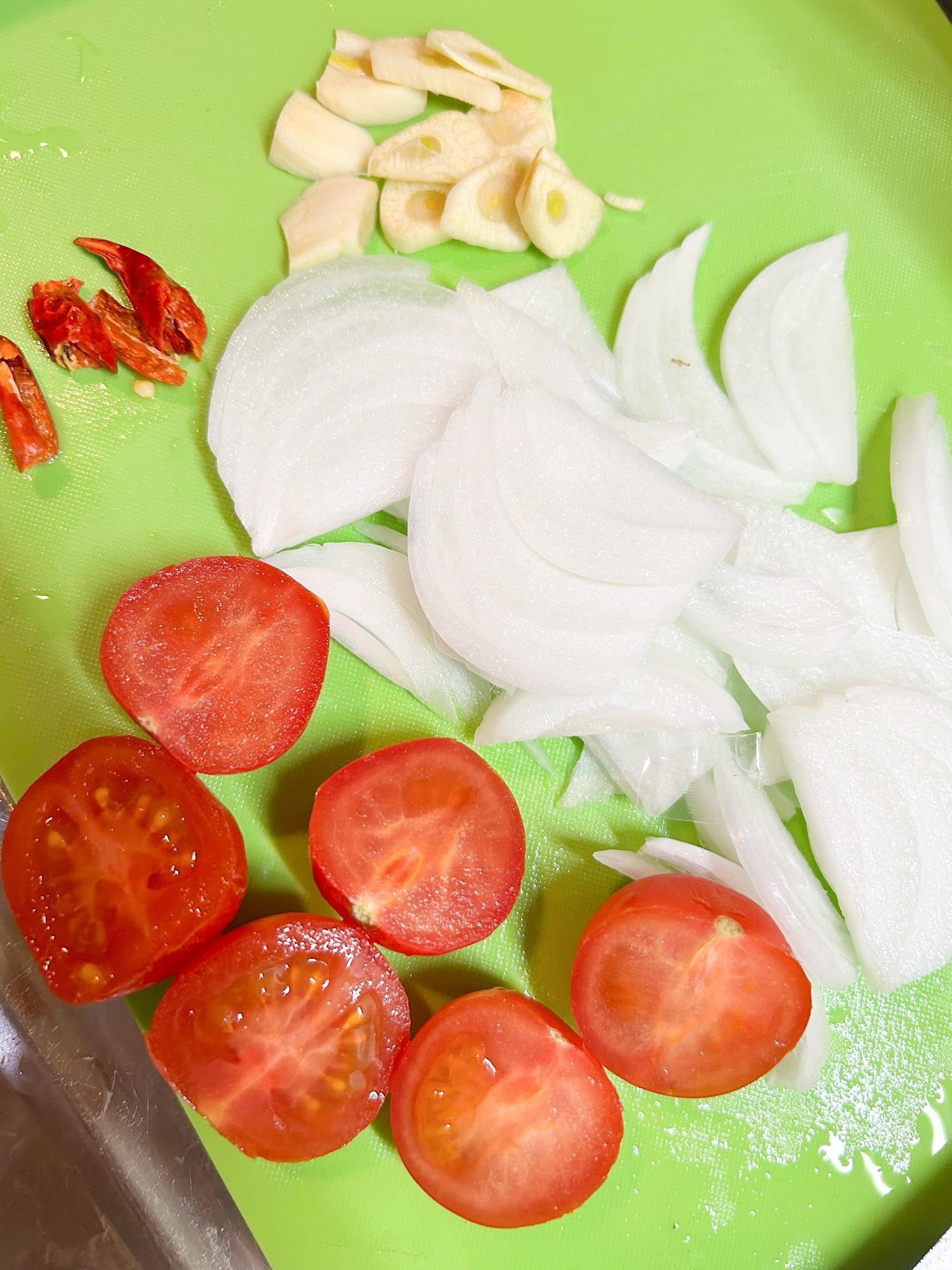 玉ねぎがしんなりしたら、トマトも加えて温める程度に火を通し、一旦火を止めておきます。