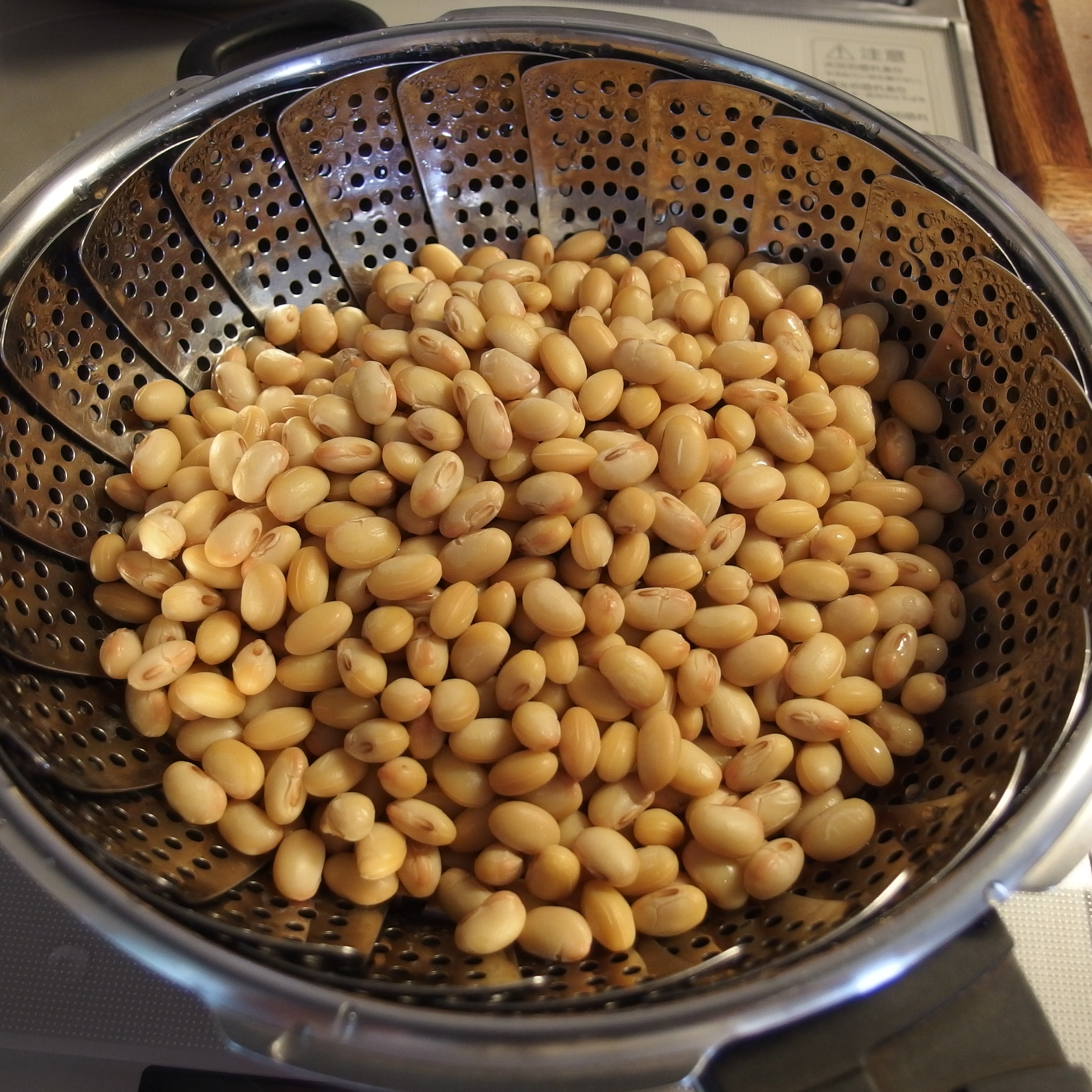 4時間以上水につけておいた大豆を蒸し皿に入れて水を2㎝高さまで入れた圧力鍋を火にかける。