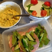 ハムにレタス、きゅうりをのせタルタルソースをかけトマトを飾る