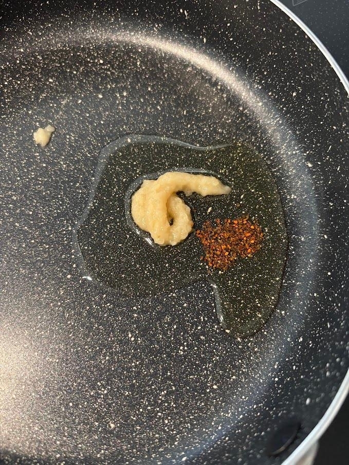 フライパンにオリーブ油をひき、にんにくと一味唐辛子を乗せて火にかけます。