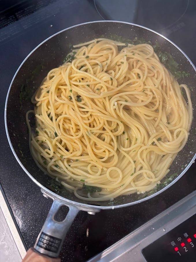 鷹の爪の代わりに家にあった一味唐辛子を使いました。お家で作るパスタです、あるもので代用しちゃいましょう!(七味でもOKです←実証済)