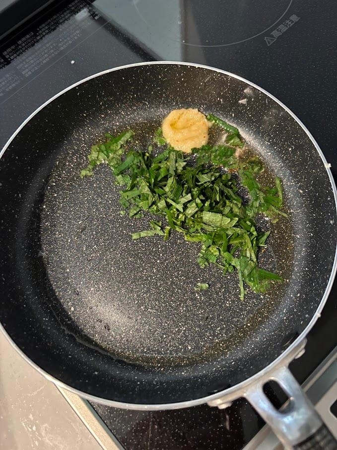 【3】でニンニクの香りがしてきたらみじん切りにした大葉を加えます。