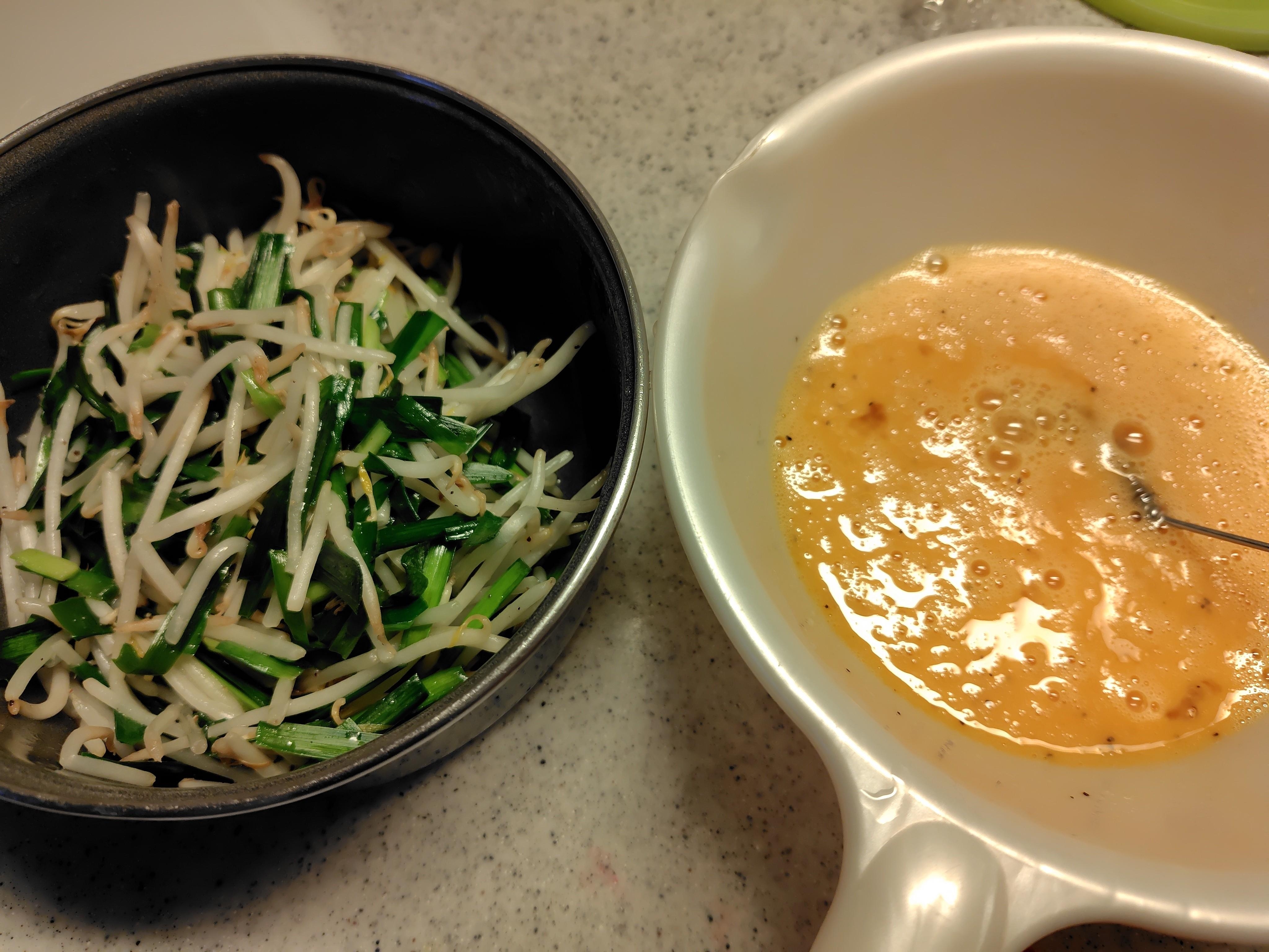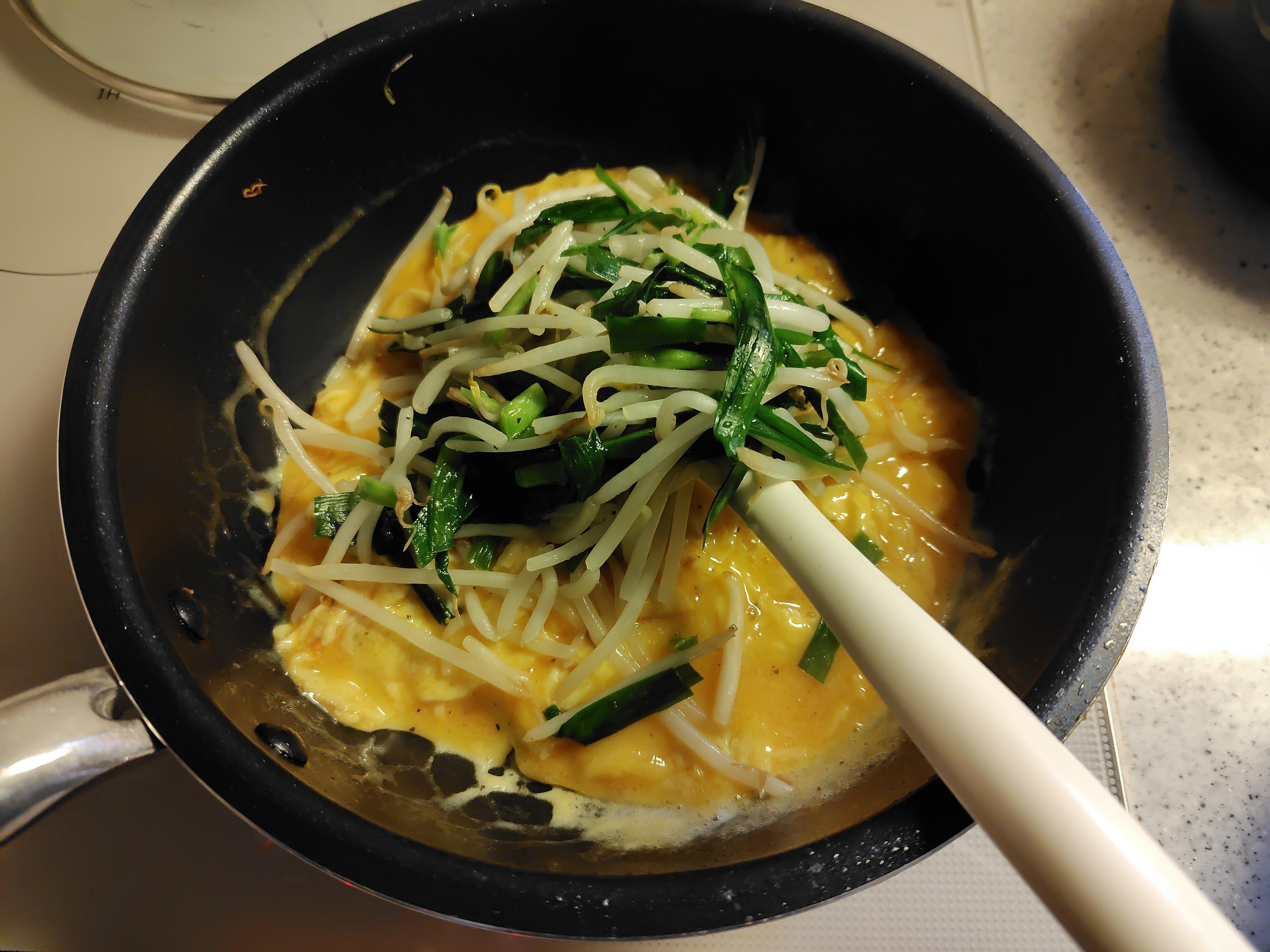 同じフライパンにごま油大さじ1を足し熱くなってから溶いておいた卵液を流し入れゴムベラなどでざっくり炒め、ニラともやしを戻して混ぜ合わせる