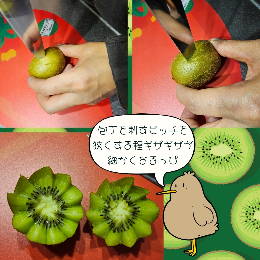 キウイは胴回りに包丁を斜めに入れ、中心部まで刺す。間隔を開け、同様に切れ込みを一周入れる。今度は並列して逆向きにV字の繋ぎ目を作る様に中心部まで刺していく。上下を引き離し皮を剥く。