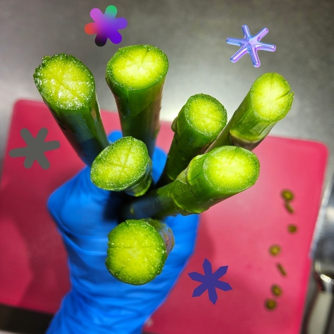 アスパラは切口が乾いているものは根本を3mm位切り落とす。次の手順に移るにあたり説明をば。野菜は収穫後も自らの身命を賭して、芽差し、花咲き、種を作る等して次代へ子孫を残そうとする。