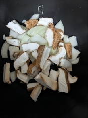 ホットクックの内釜に、玉ねぎは薄切り、しいたけは、細切りにして入れる。