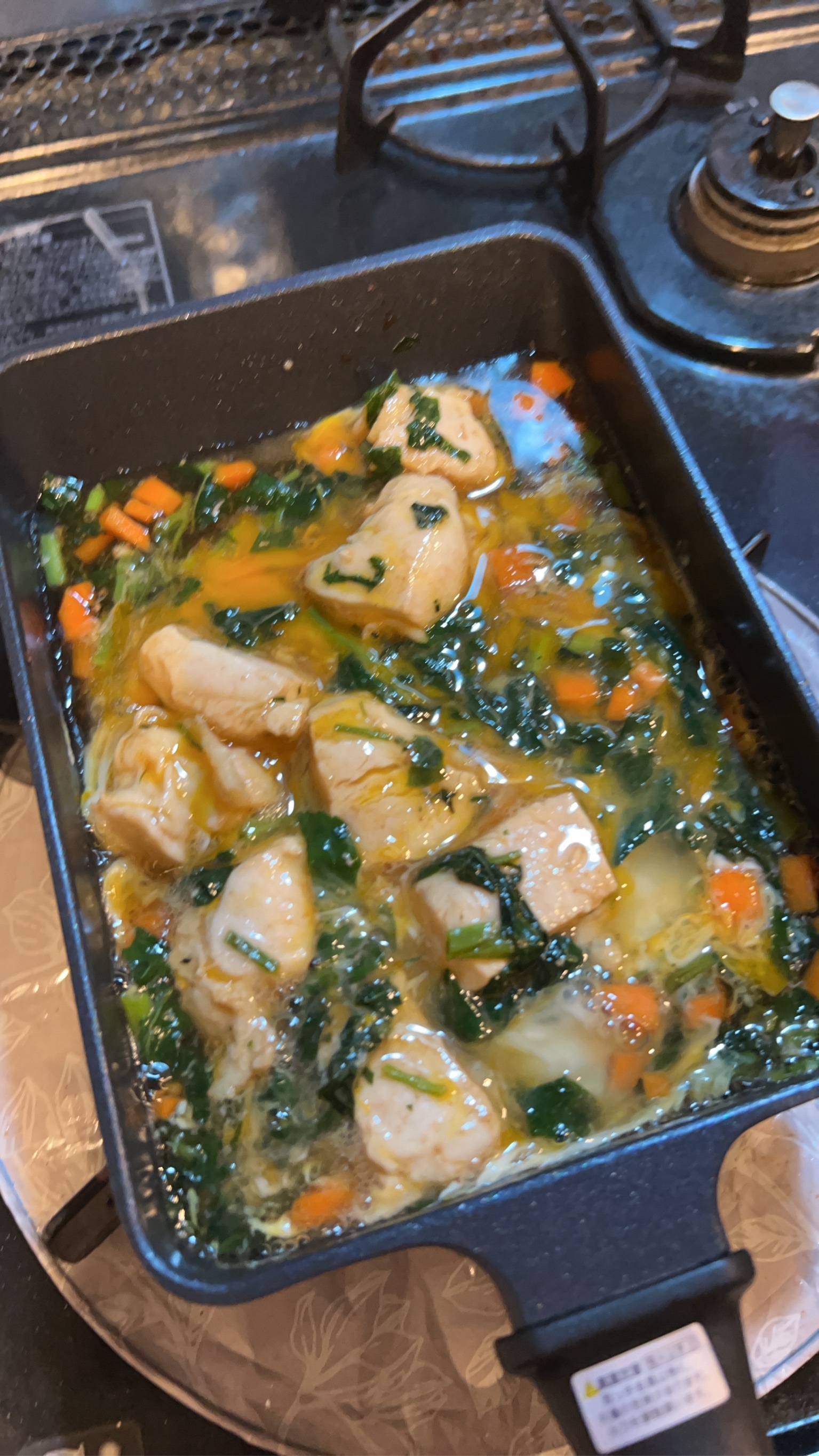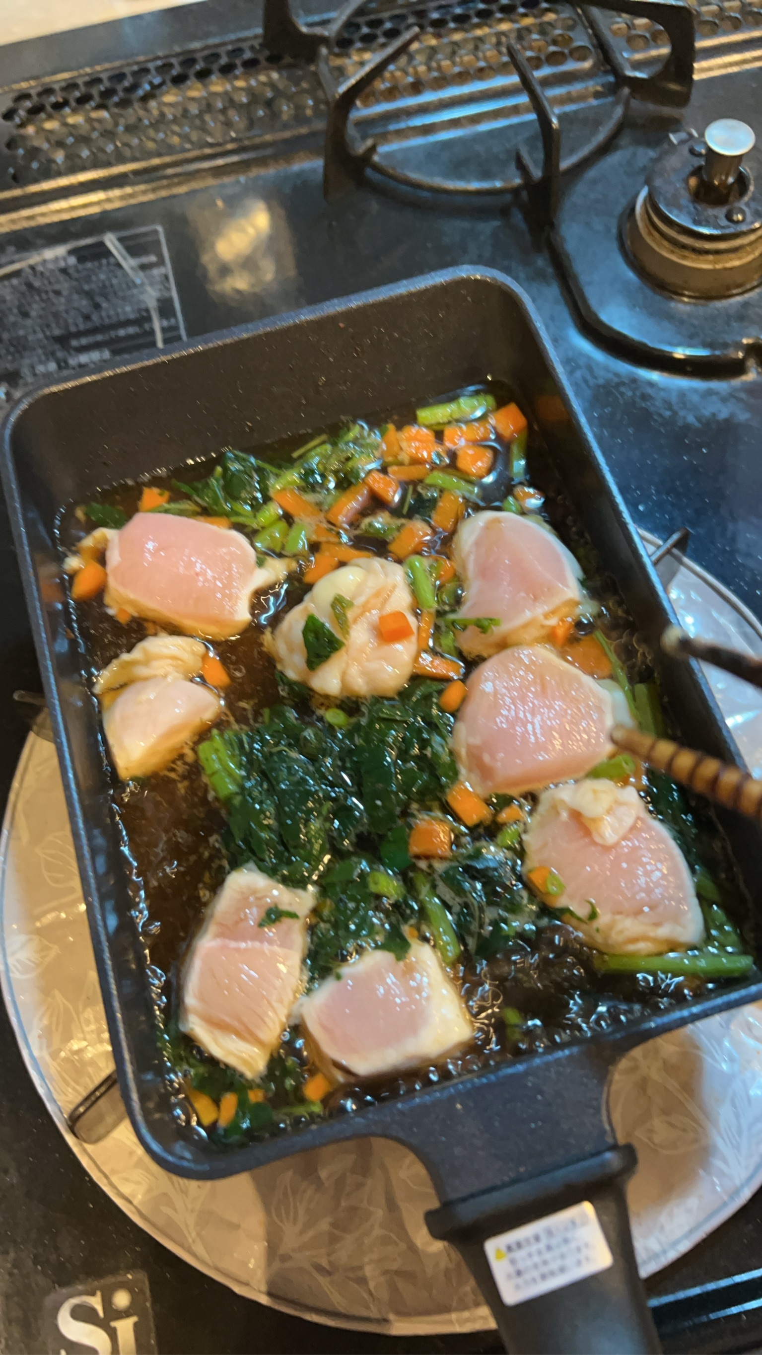 沸騰したら鶏肉を加え中火〜弱火でゆっくり火を通しながら鶏肉は両面から焼き中まで火を通す