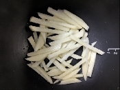 じゃがいもを細切りにして、10分水にさらす。水を切って、ホットクックの内釜に入れる。