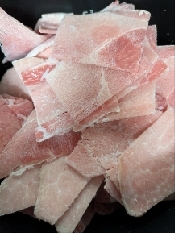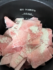 じゃがいもを水でさらす。豚肉とじゃがいもの重さの0.6%の塩コショウを入れる。