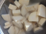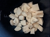 ホットクックの内釜に水を切ったさつまいも、水を入れる。