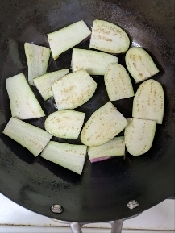 ナスを炒めるとき、たまにフライパンをゆらすくらいにする。ナスは、油吸ったほうが美味しいので、油を2回に分けて入れる。