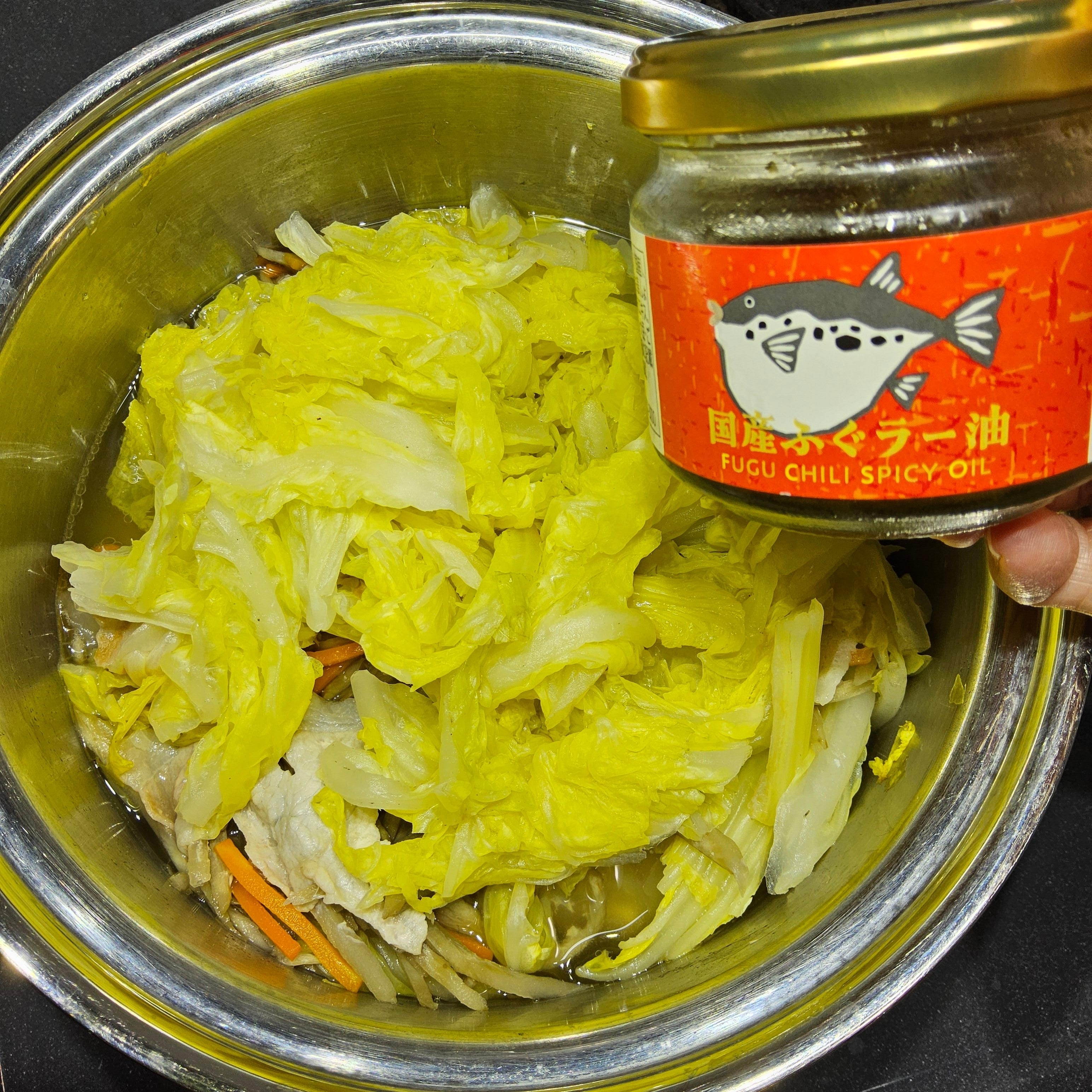12分後、嵩が減ったところに白菜の葉を詰め込む。蓋をした儘、更に13分煮込む。味煌を溶かし混ぜ、余熱で30分置く。器に盛り、ふぐラー油をかけて刻んだ青葱を散らし、糸唐辛子を乗せる。
