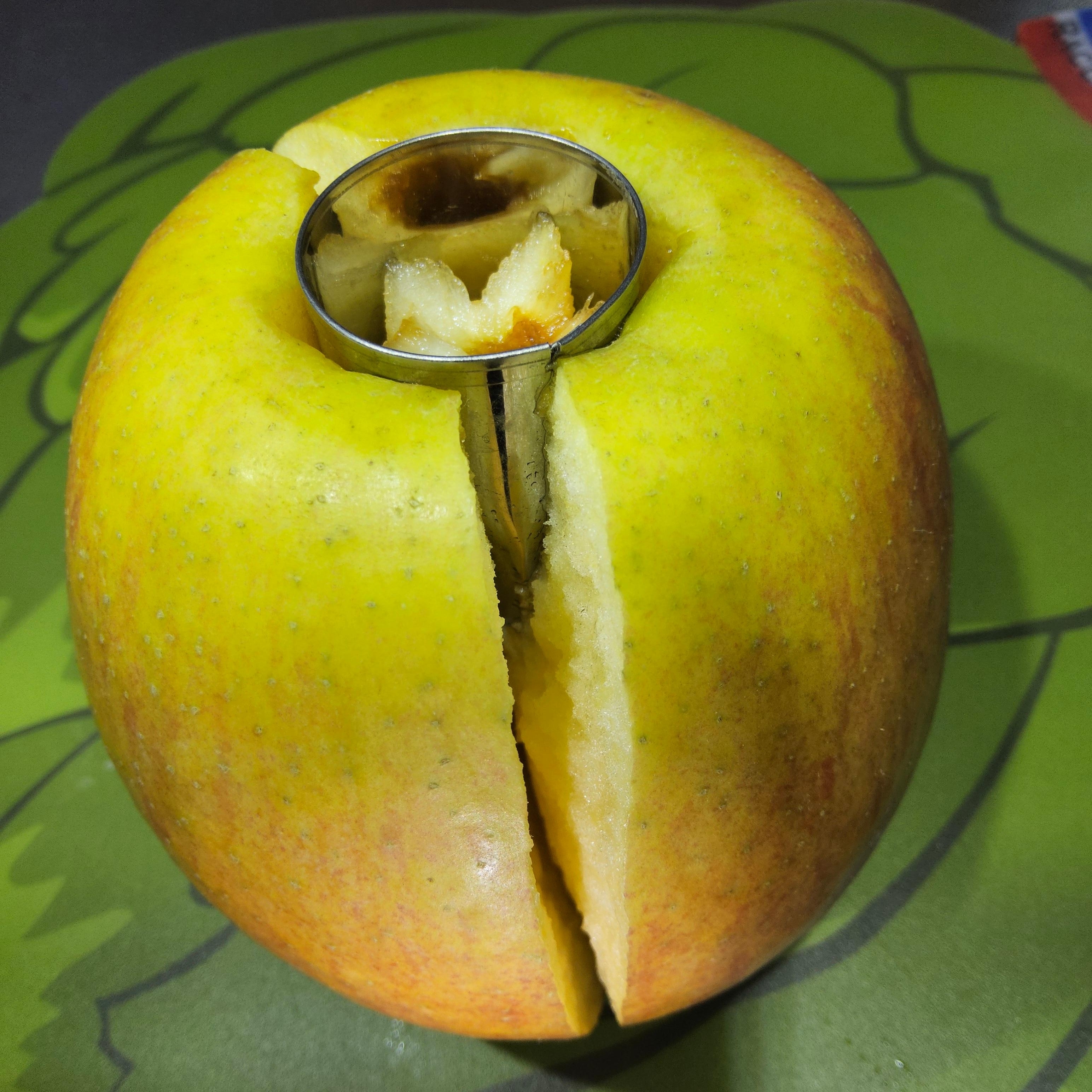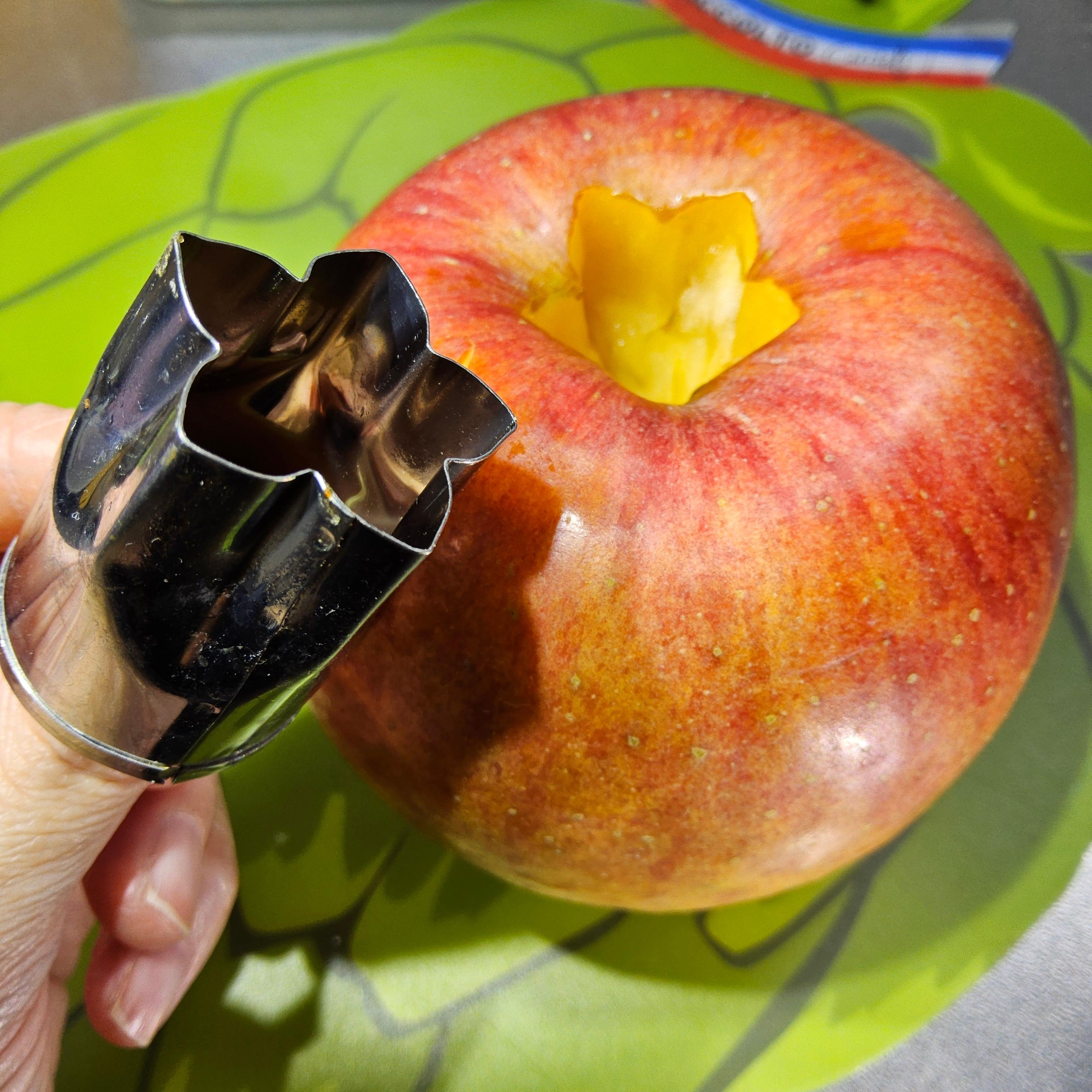 一般的なサイズの林檎だがスクリュー先端が深さ半分にも及ばず。芯はカスと呼べる位の僅かな量しか取れず只小さな細い穿孔が覗いた丈という想定内のショボさ。花の型抜きで上部の芯をくり抜く。