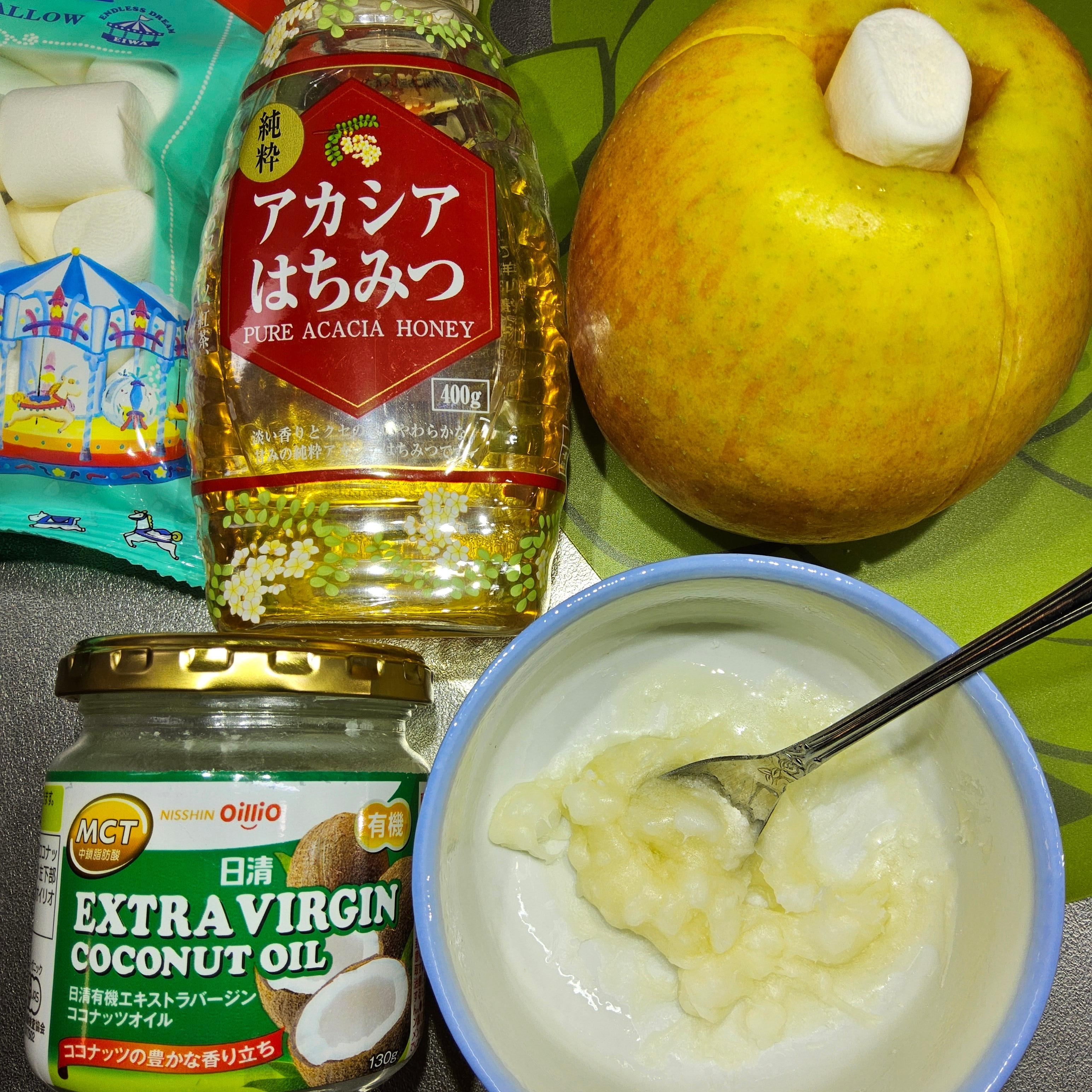 *¹ココナッツ油が液化する夏場はマシュマロ栓では心許なく液垂れし易い為、尻は残し上部2/3已くり抜く*²加熱時に林檎から出る水分、熱で溶けたマシュマロ⭐が溢れ庫内が油で塗れるのを防ぐ為、耐熱特大深皿推奨。果汁⭐一滴たりとも無駄にしてはならぬ