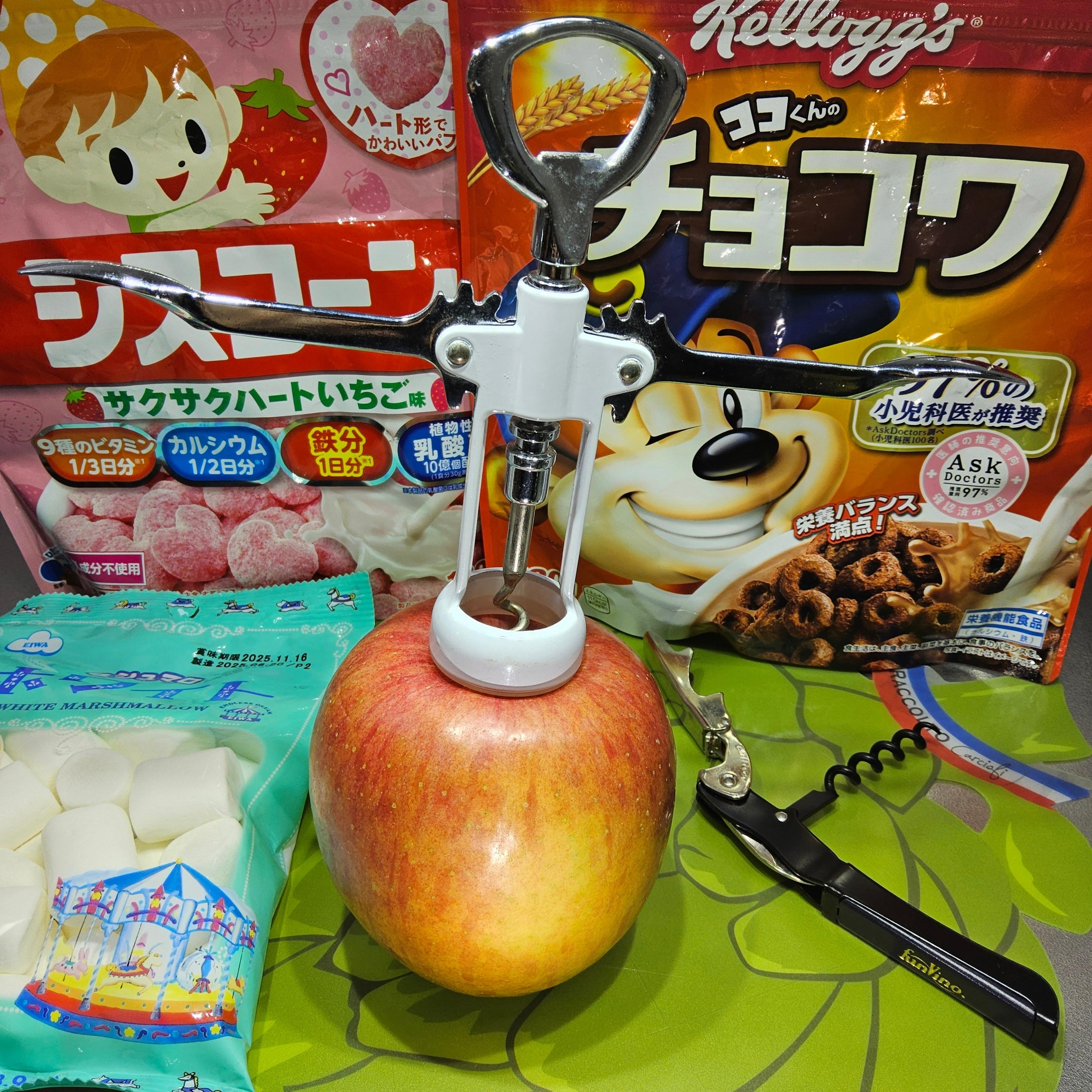 林檎は水平に立てて置き、コルクスクリューを林檎の蔕の中心に突き立てて回しながらワインのコルク栓と同じ要領で芯に確りと捩じ込む。スクリューを真っ直ぐ引き上げて芯全体を根刮ぎ抜き取る。