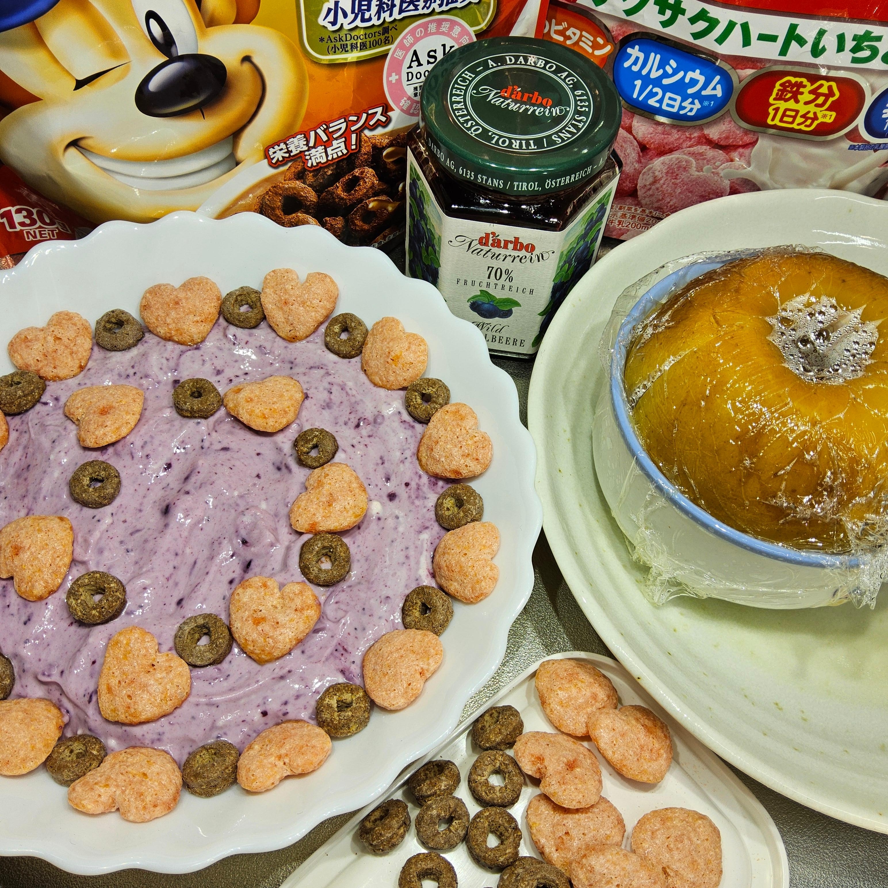 器に⚪を入れ、チョコワ2掴みとシスコーンを4ハート除けて散りばめる。火傷に注意しながら⑤のラップを取って中央に乗せ、穴に残りのチョコワを詰めシスコーンを飾る。溶けた⭐を回しかける。