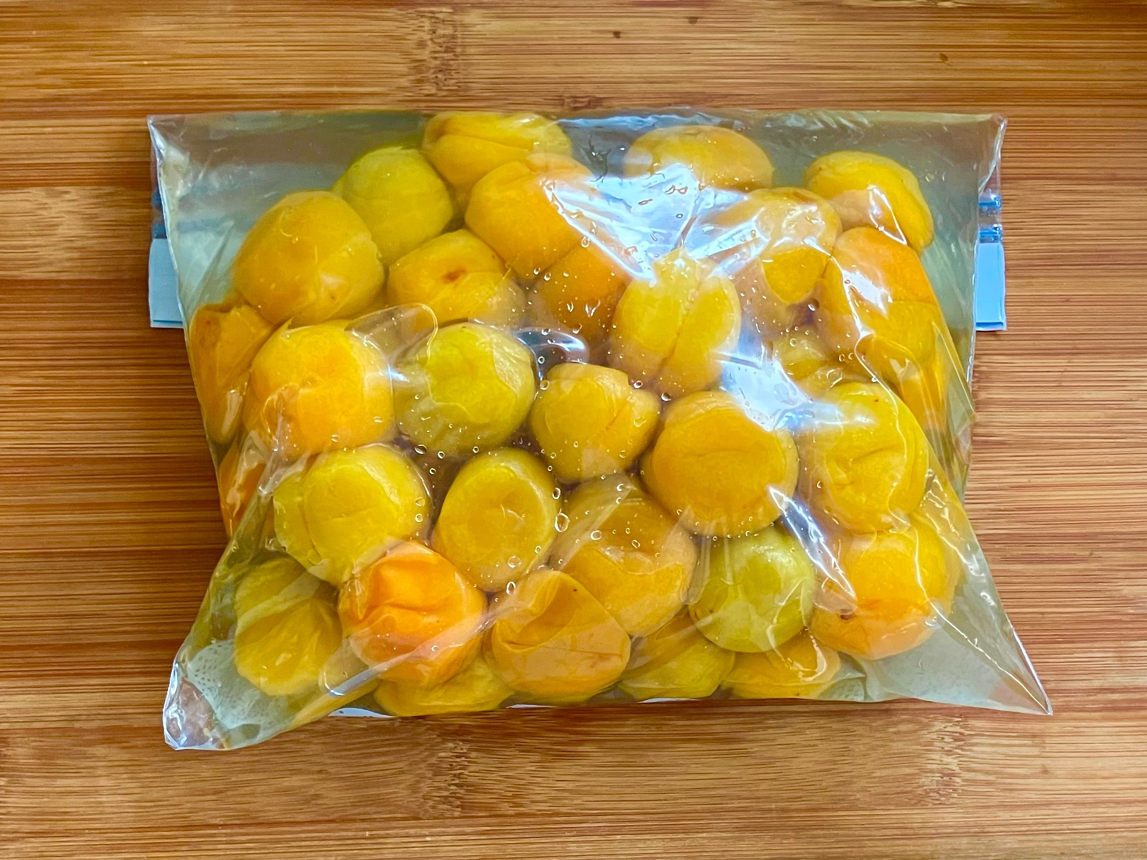 梅にまんべんなく塩と焼酎を絡ませたら空気を抜き閉じる。