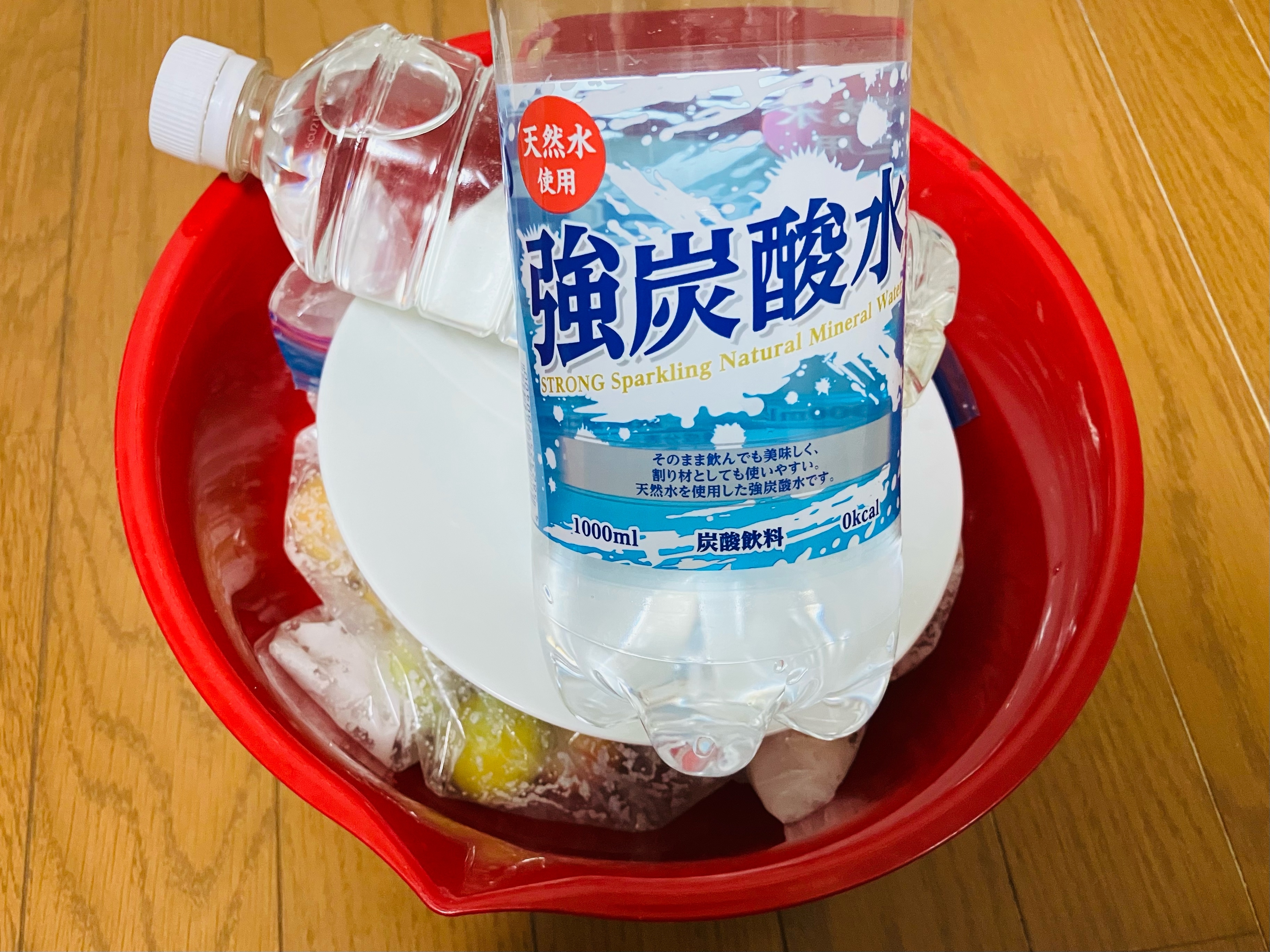 皿を④に乗せ梅の2倍の重さの重石(ペットボトルに水など)をする。梅が隠れるぐらい漬け汁が出るまで1日1回上下を皮が破れないようそっとひっくり返す。日の当たらない場所で保存。