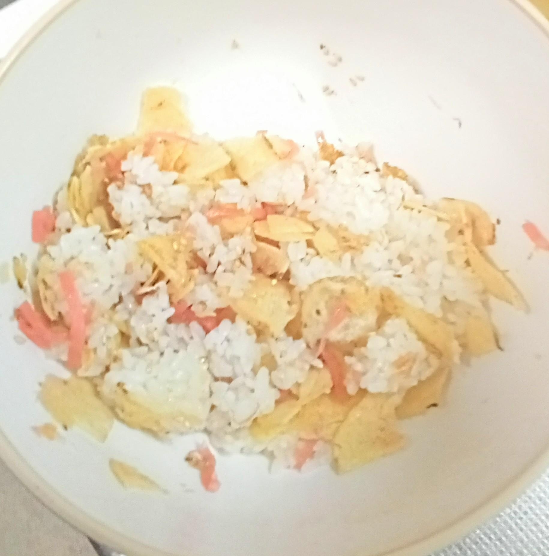 ご飯が温かいうちに ポテトチップスをまぜてください。 サクサクのうちに混ぜると 細かく砕けやすいです! 分量などは お好みで調整してください。