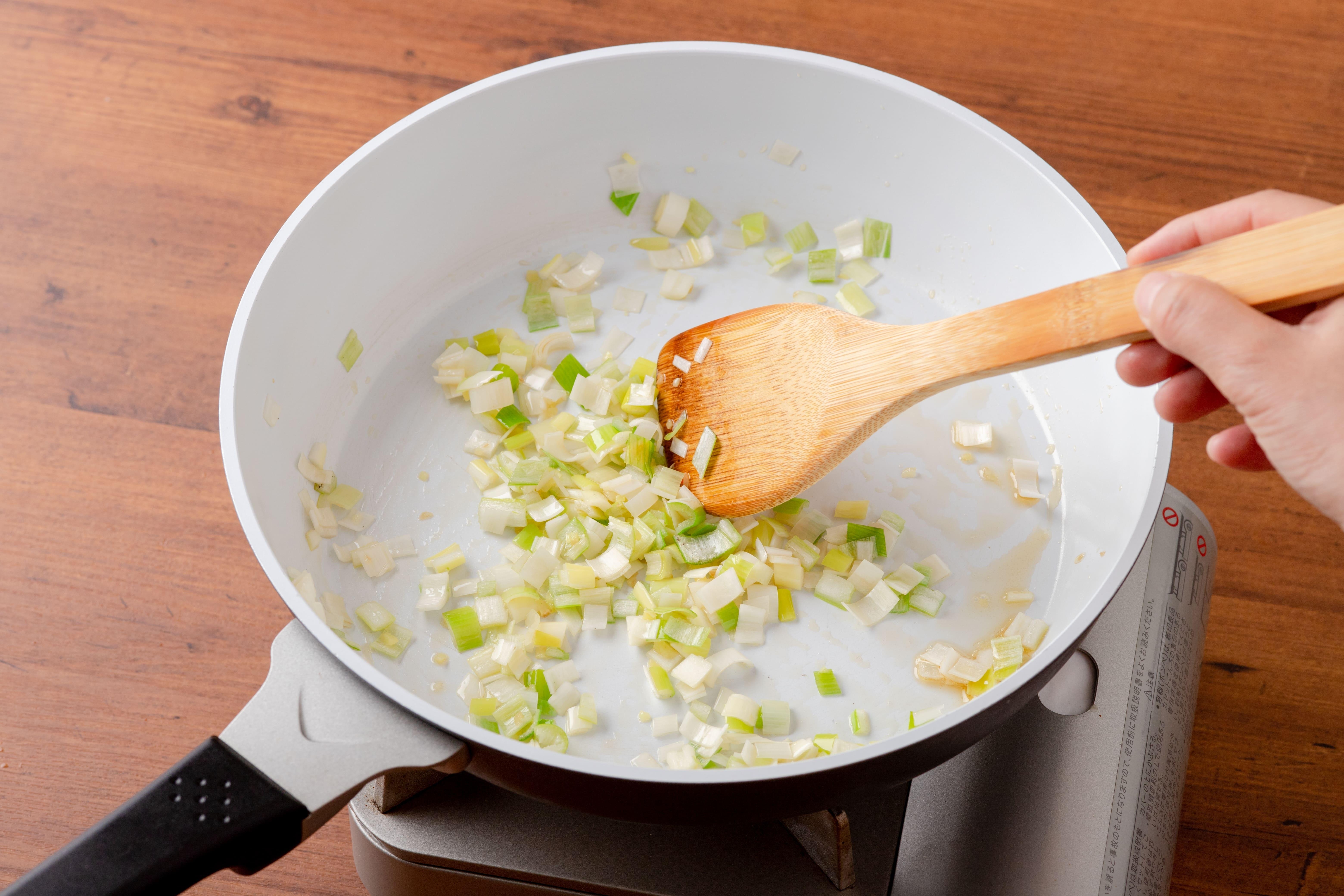 フライパンにごま油、しょうがを入れ中火にかけ、香りが立ってきたら、長ねぎを炒める。
