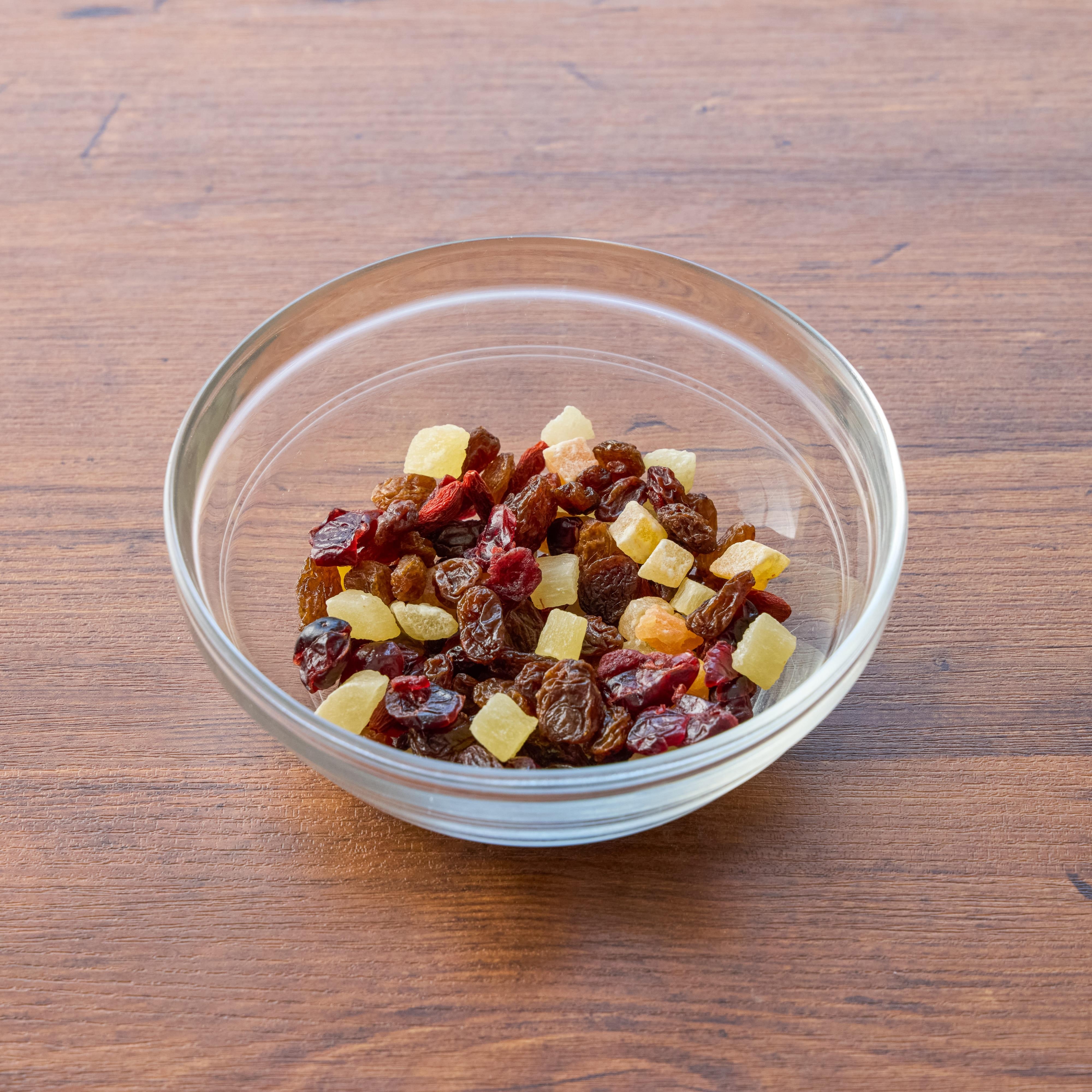 サイズの大きいドライフルーツは細かく刻む。今回は、クランベリー、レーズン、パイナップル、マンゴー、パパイヤを使用。