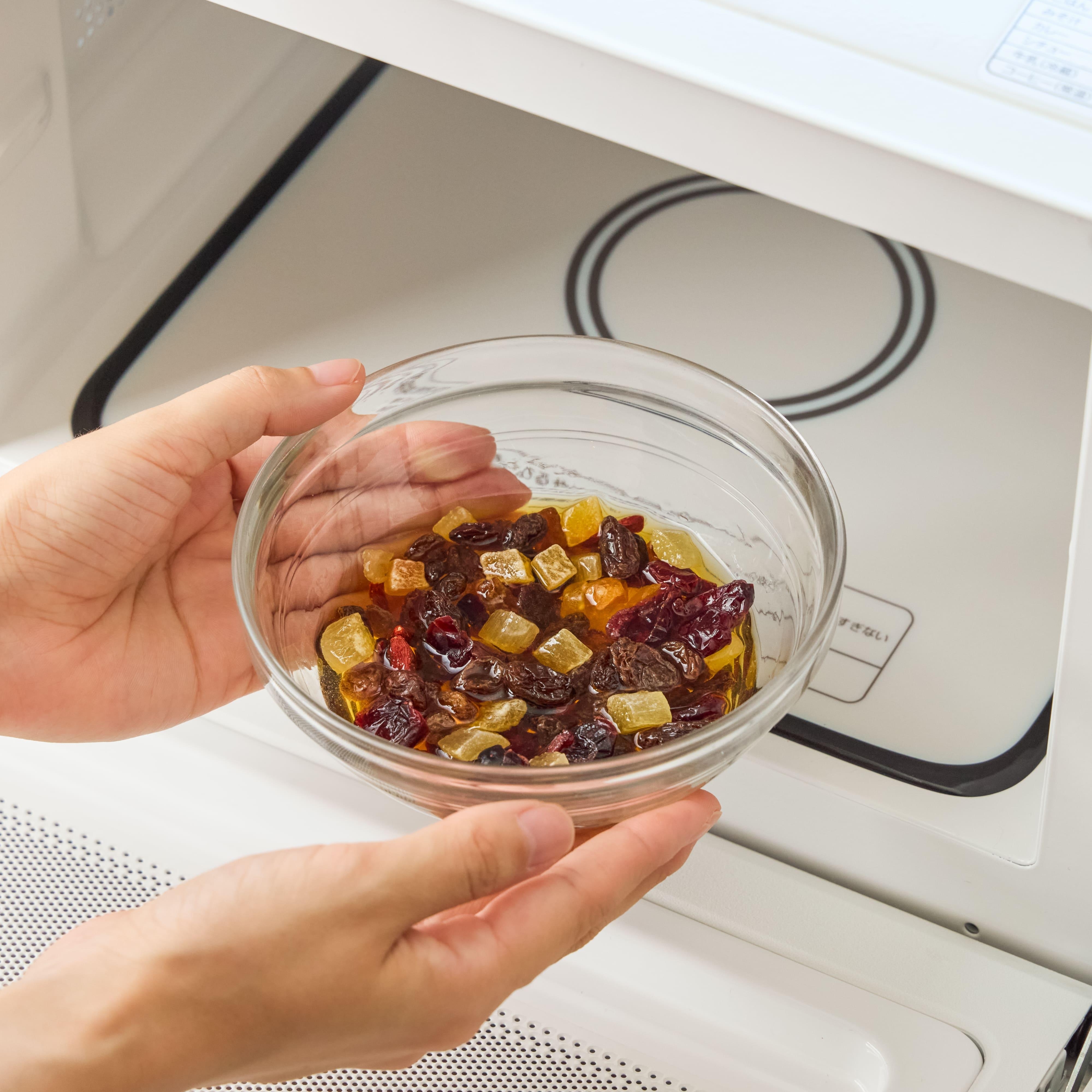 (A)を耐熱容器に入れ、ラップをかけずに600Wの電子レンジで1分ほど加熱し、粗熱をとる。
