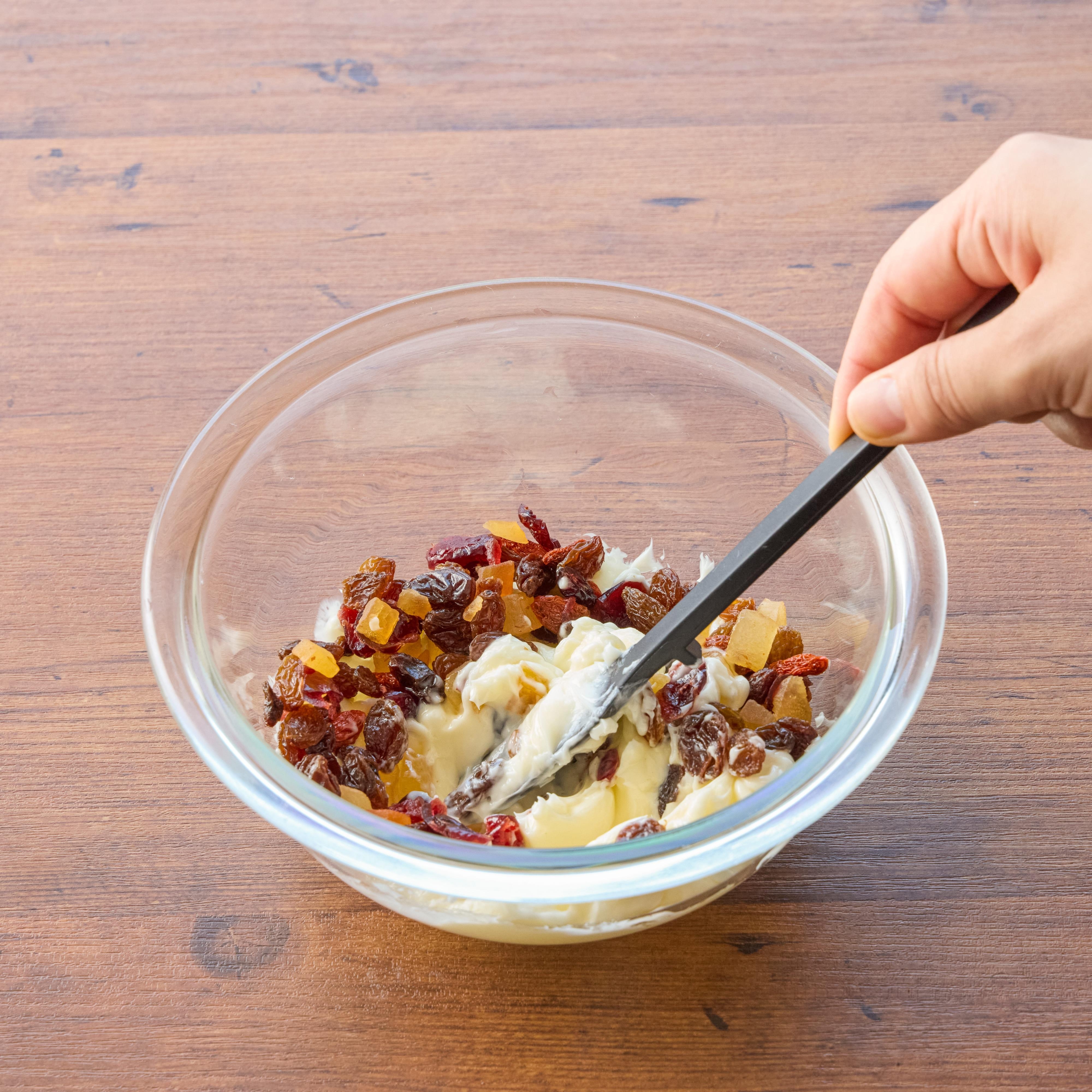 大きめのドライフルーツは、細かく刻むことで、カットしやすくなり、見た目もきれいに仕上がります。 カットする際は、温めた包丁で手早く切るのがポイントです。