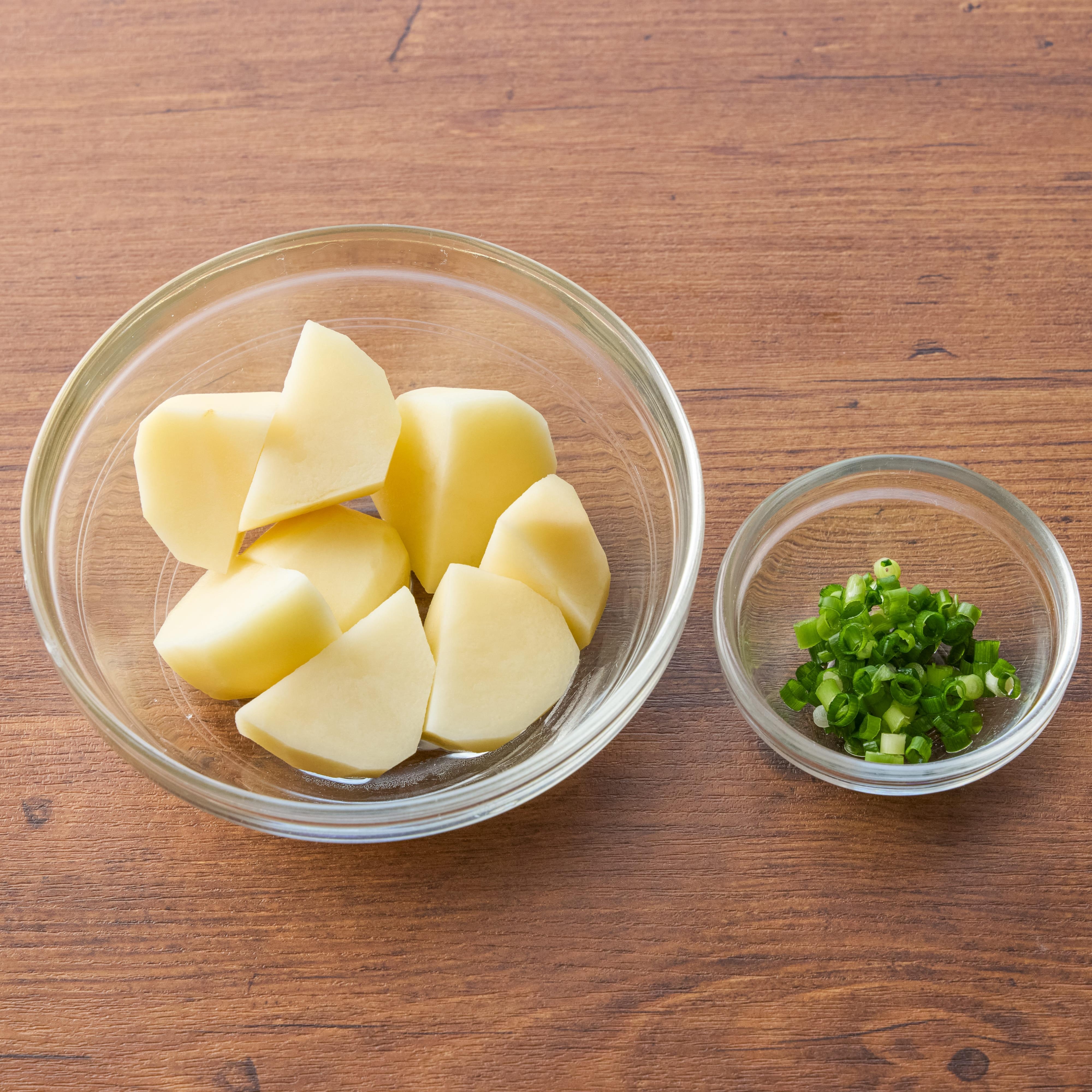 じゃがいもはひと口大の乱切りに、小ねぎは小口切りにする。