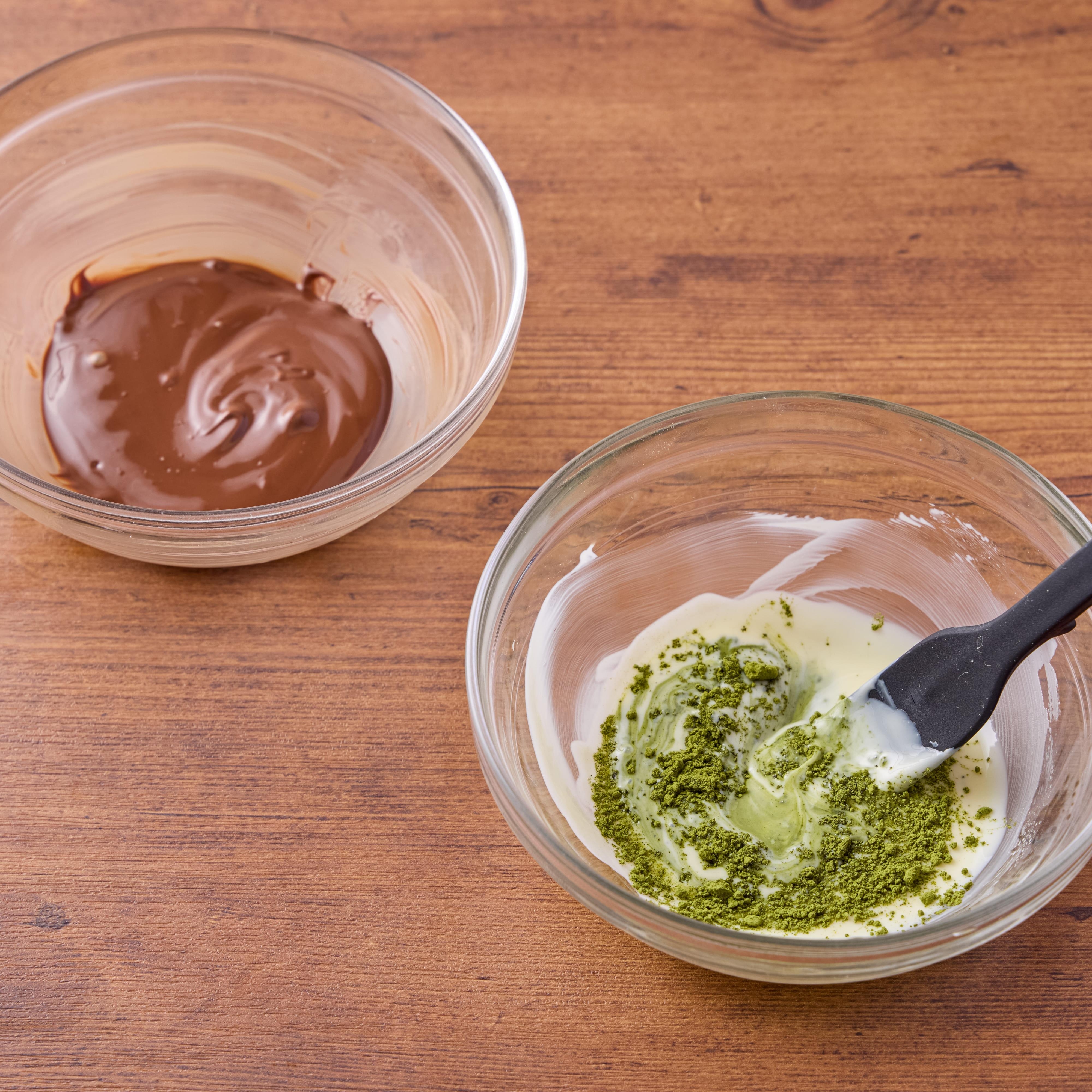 チョコが溶けたら、ホワイトチョコのほうに抹茶パウダーを加えて混ぜる。