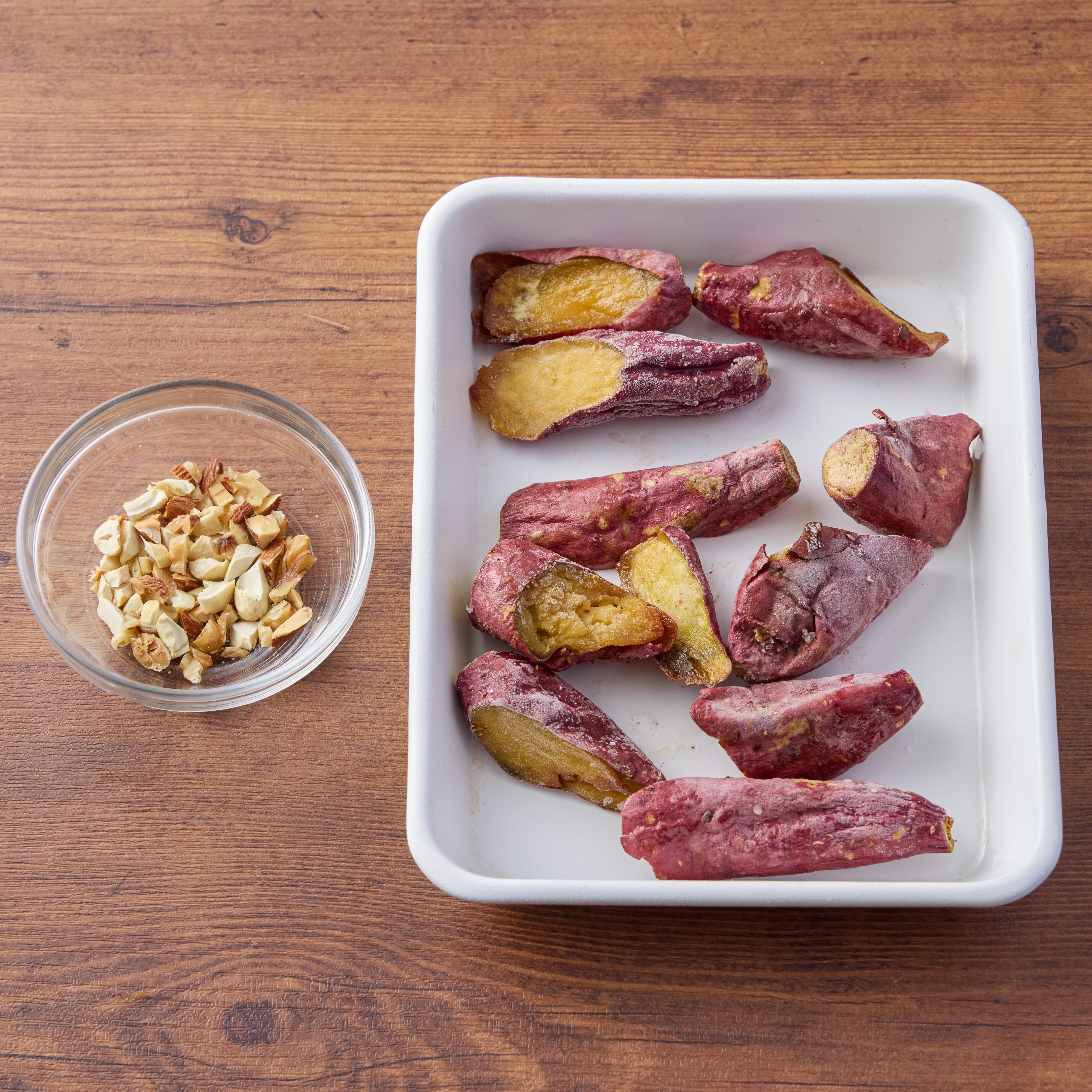 そのままでも美味しい、ねっとり食感の甘じょっぱい焼き芋フライドポテトに、ビターチョコと抹茶チョコをコーティング。見た目もかわいい簡単スイーツに変身します。