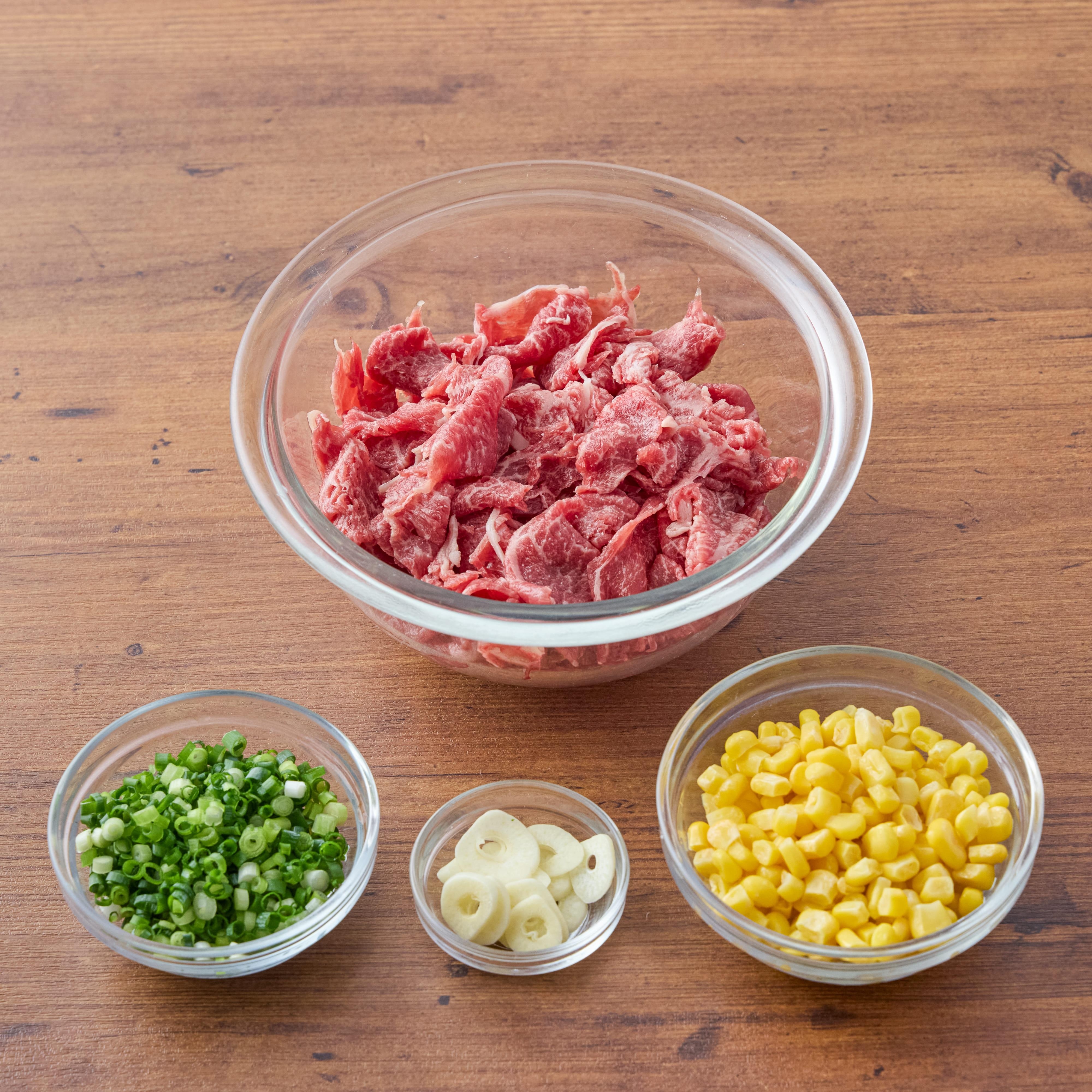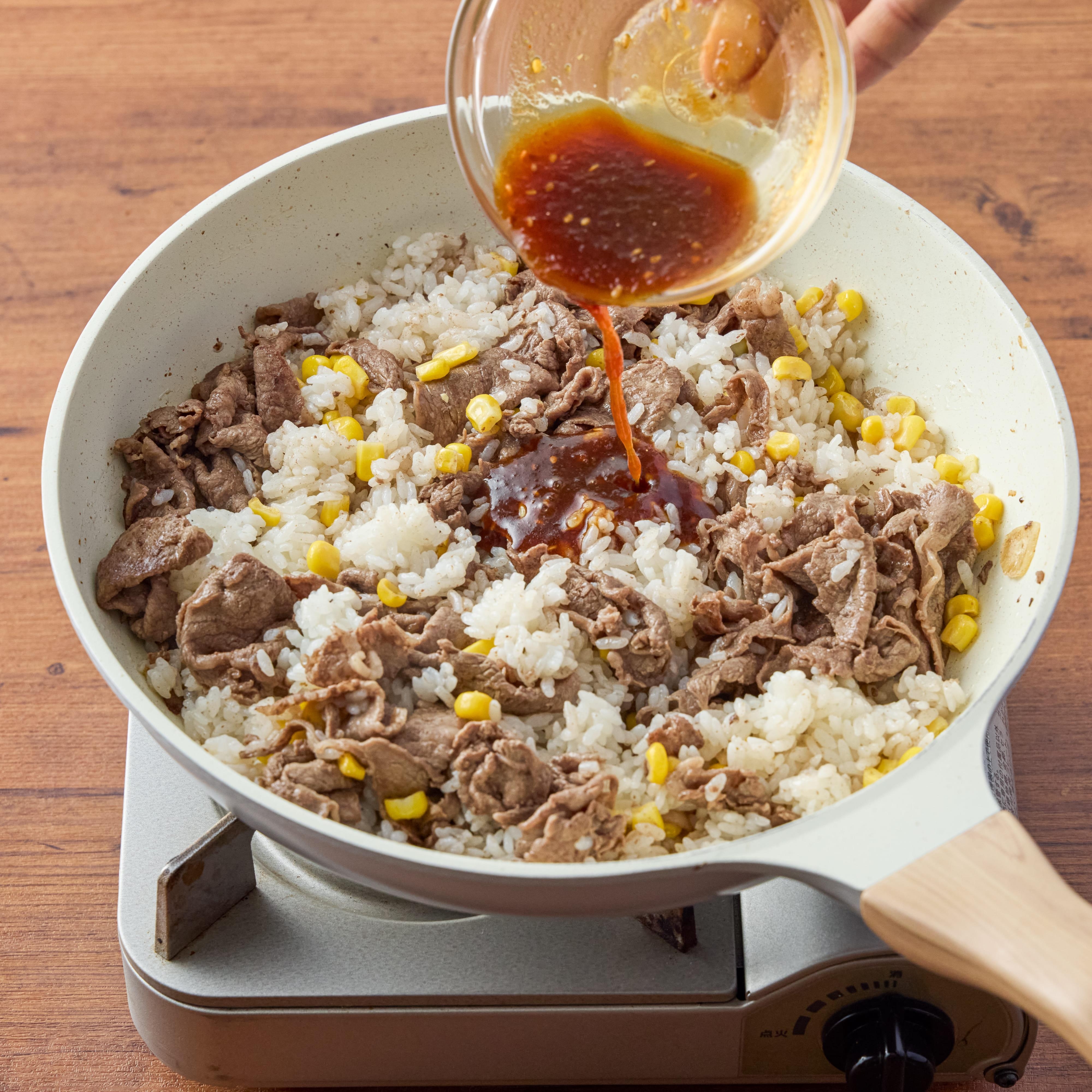 牛肉に火が通ったら、ごはんとコーンを加えて炒め合わせ、焼き肉のたれを加え、味を調える。