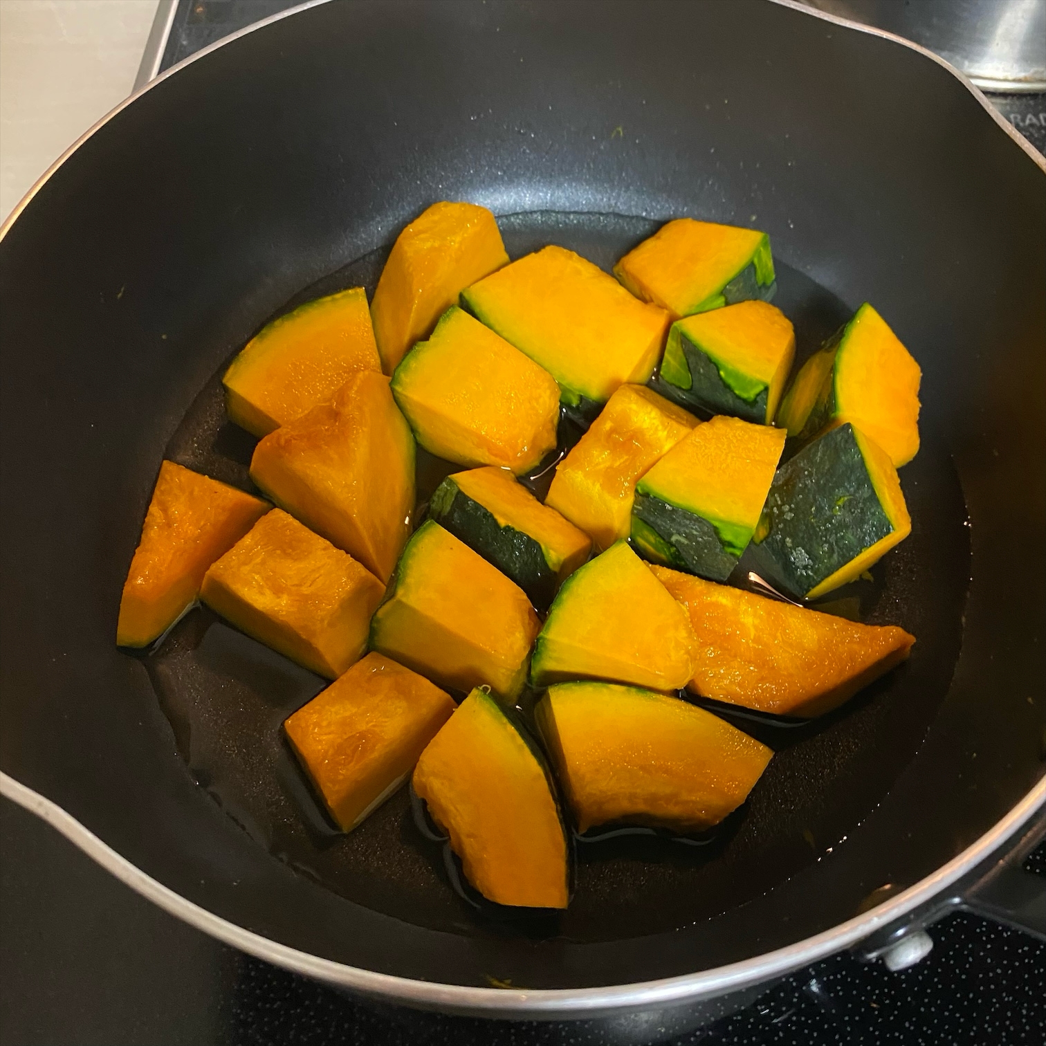 この鍋にかぼちゃが半分くらい出るくらいの量の水を加える。