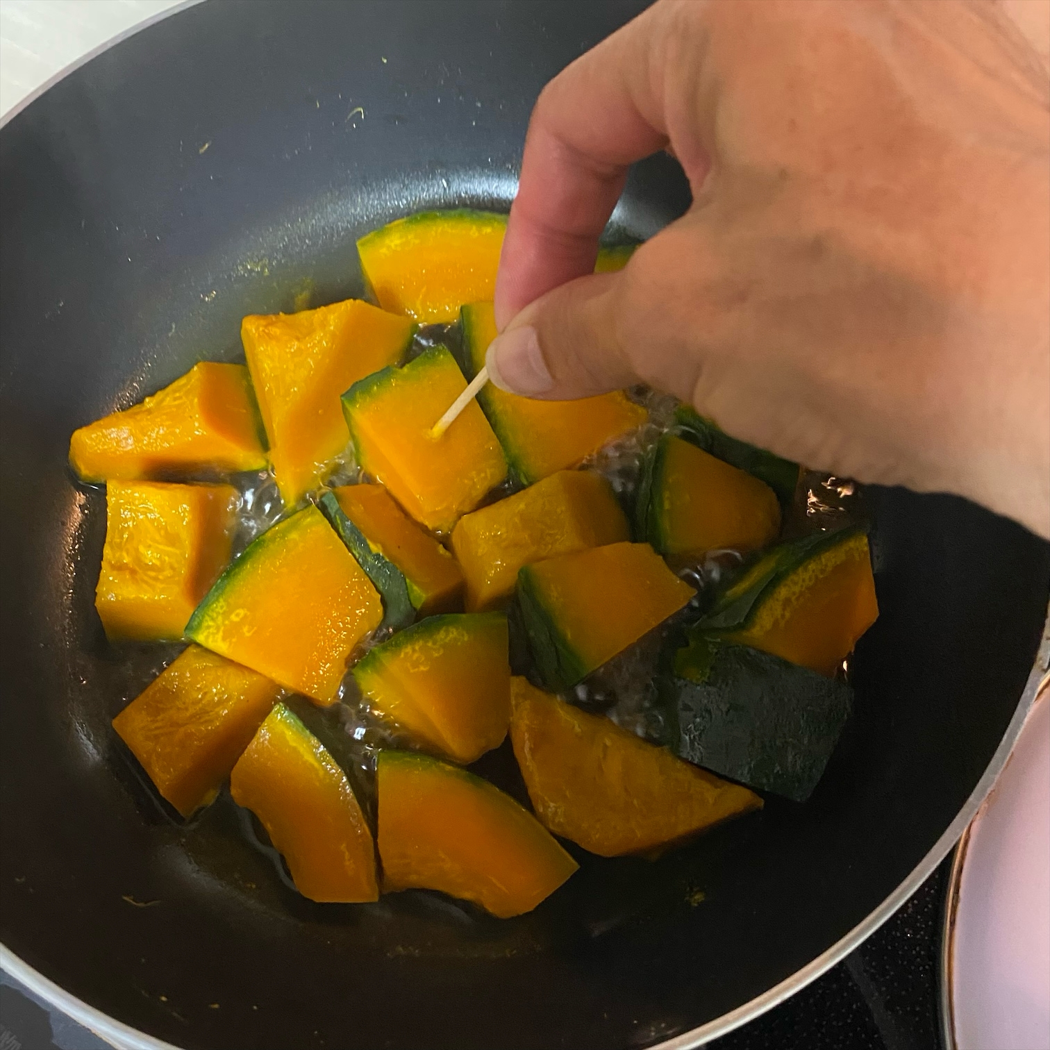 かぼちゃに楊枝を刺してみて固さをみる。スッと刺さるようなら煮上がりです。