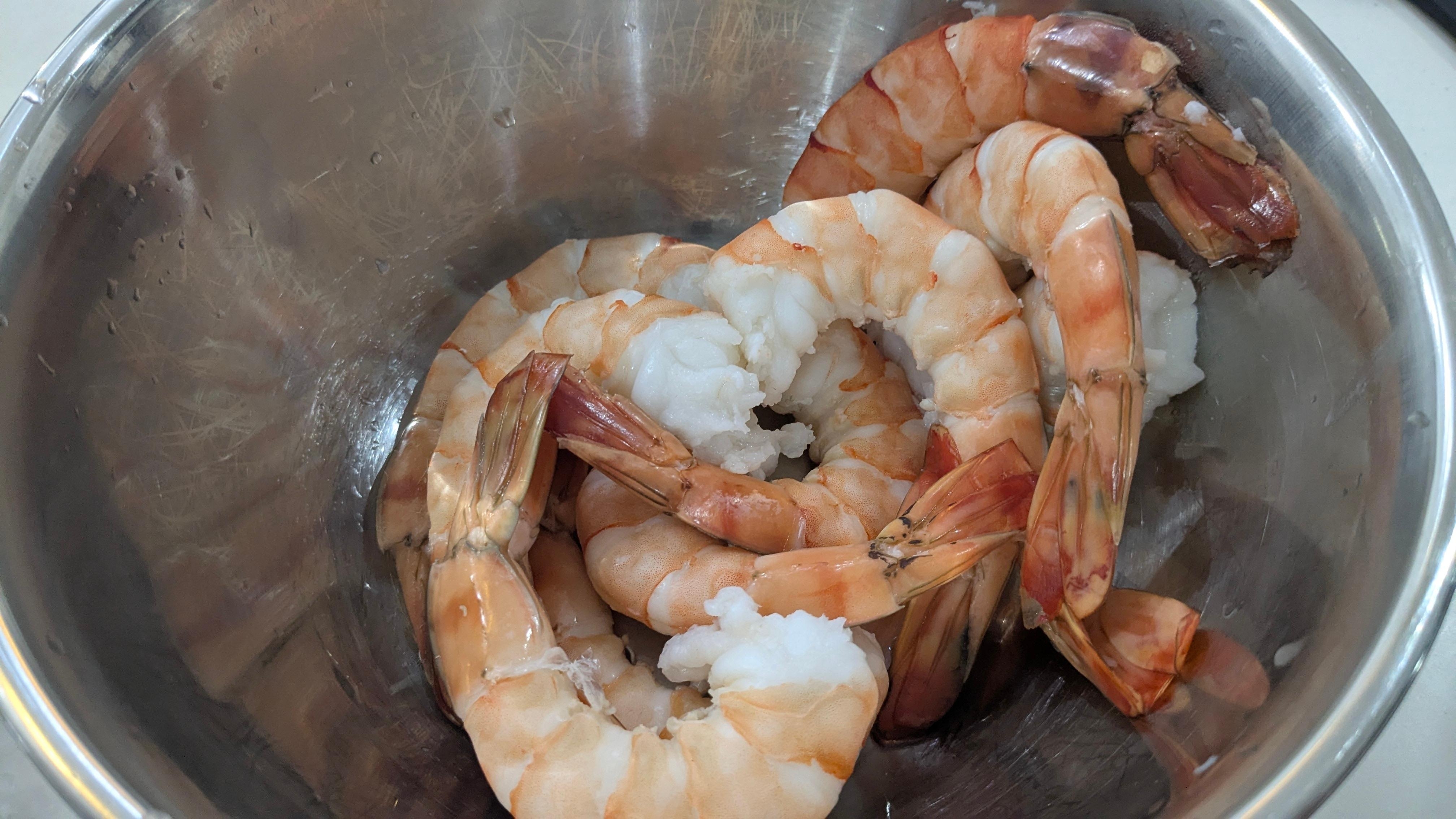 フライパンにお湯を沸かし、殻を剥いた海老を入れ約1分茹で、ザルに上げておく