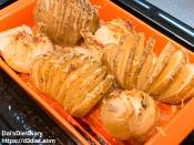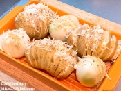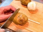 じゃがいもと玉ねぎは割り箸などを使い、切り離さない程度に切れ目を入れ、じゃがいもは切れ目を洗い水気を切ります。
