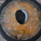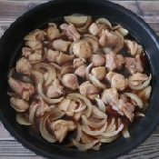 煮汁が沸騰したら、玉ねぎ、鶏肉を入れて中火で煮る。(5分程)