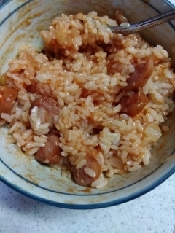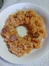 チンした玉ねぎウインナーの器に、温かいごはん、ケチャップを入れてよく混ぜあわす。