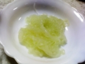 真ん中の種、わたを取り、30分くらい、中身がやわらかくなり、ほぐれてくるまで茹でます。(私は取り忘れましたが。)