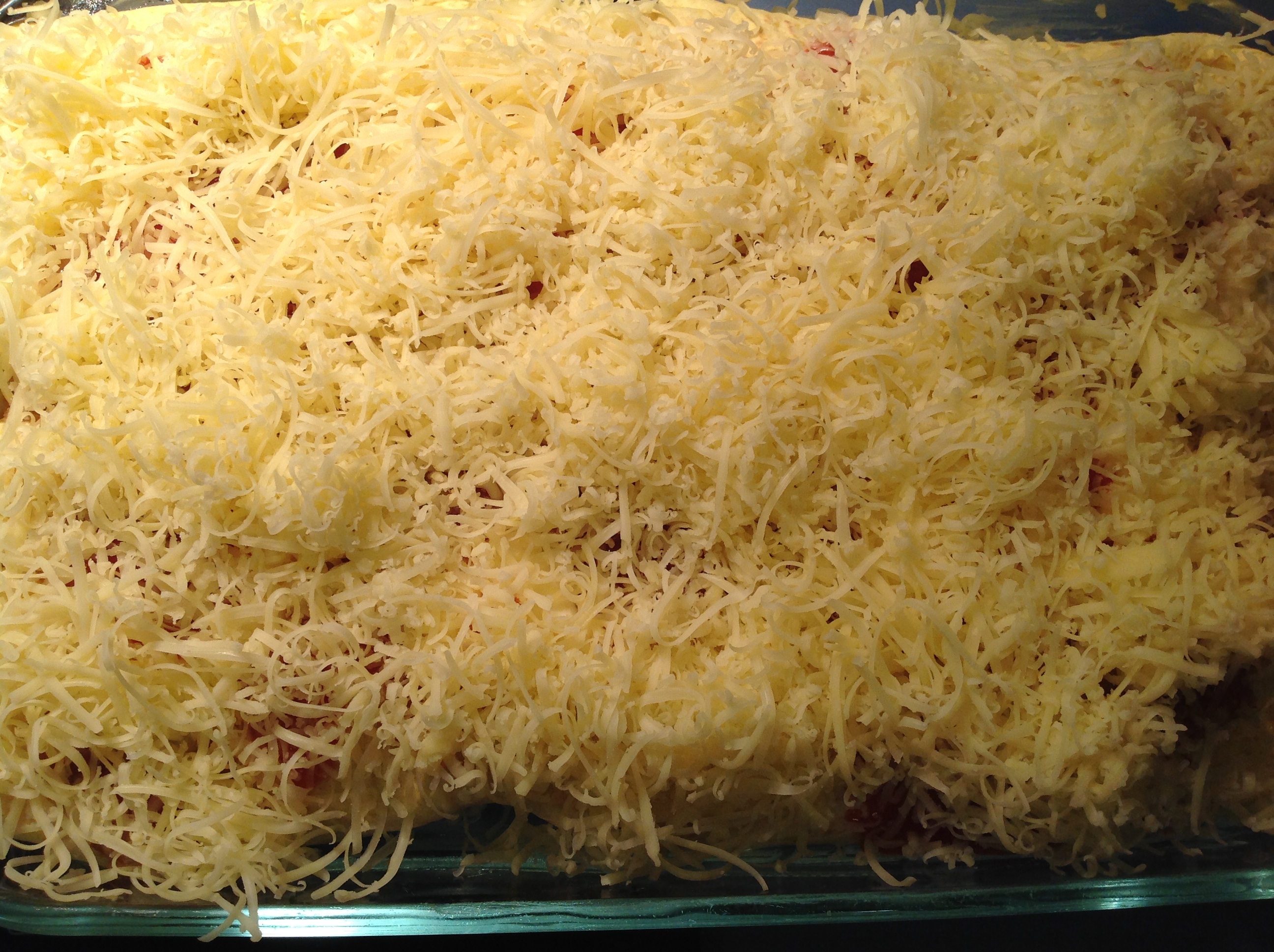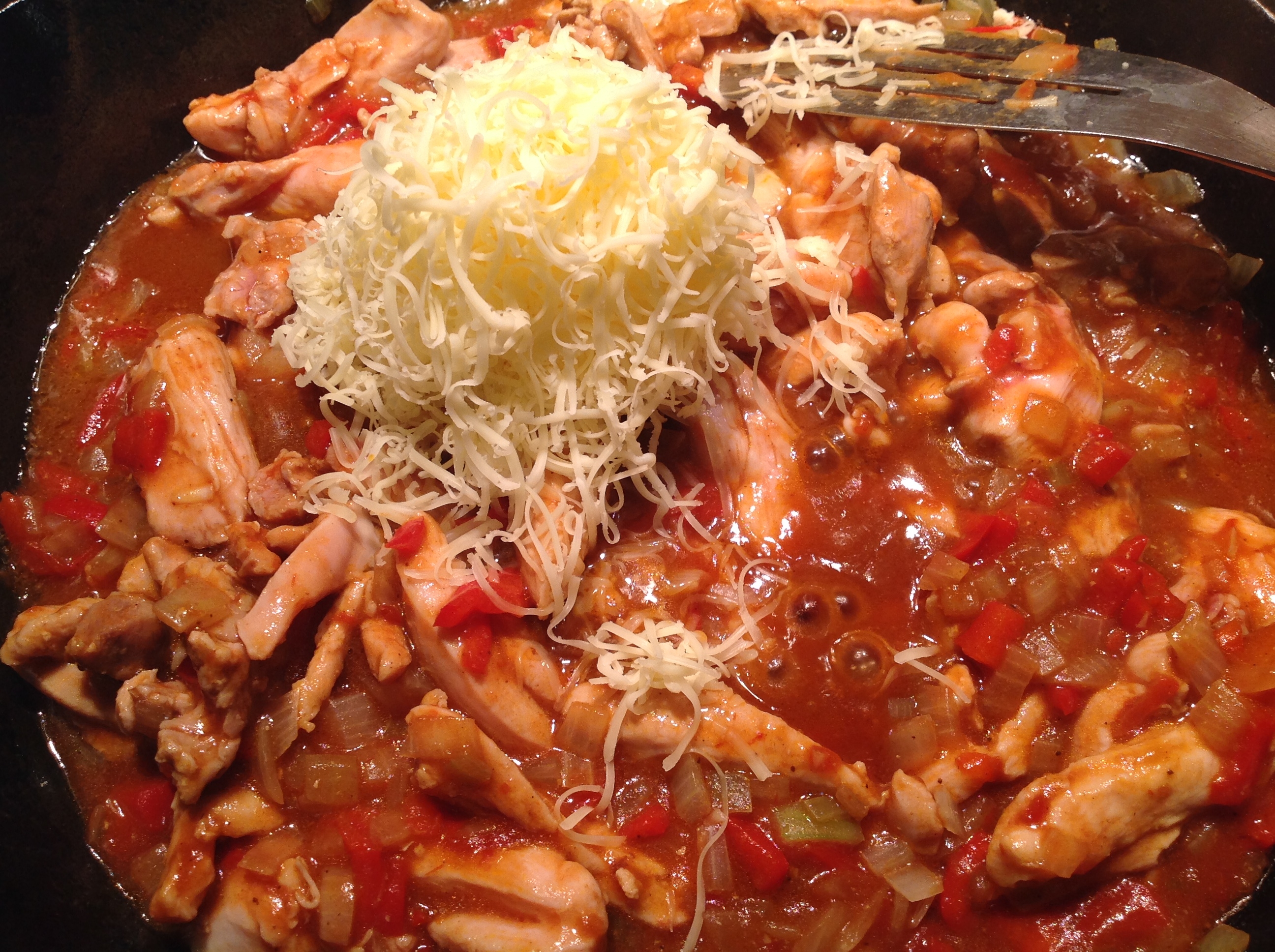 並べ終わったら、プレーンヨーグルトを回しかけ、フライパンに残った鶏モモ肉のソースの部分を上からかけて、その上に残しておいたシュレッドチーズをかける