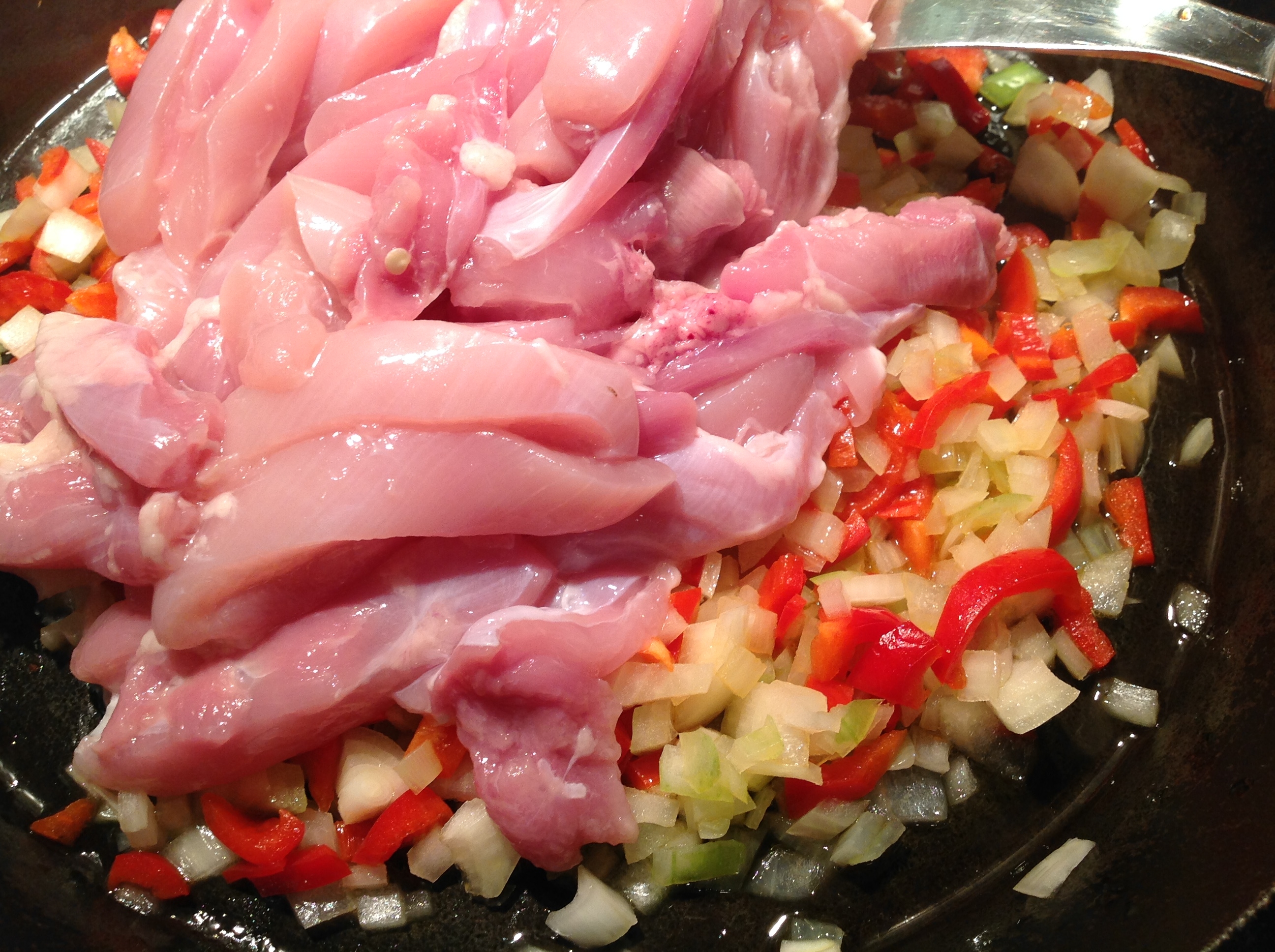 - 1 玉ねぎと赤ピーマンを粗みじん切りに、鶏モモ肉を細切りにする