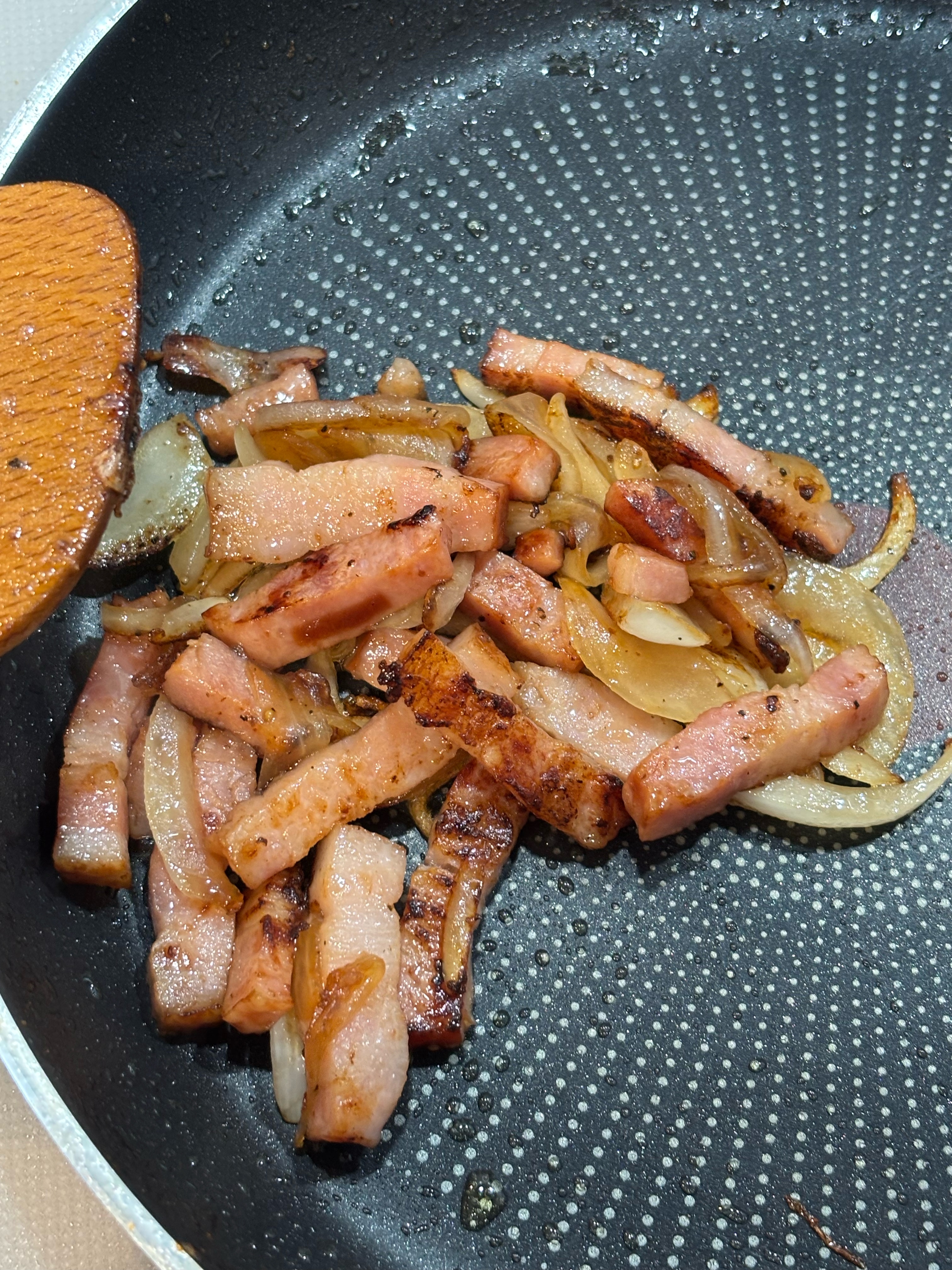 玉ねぎとベーコンをオリーブオイルでカリカリになるまで炒める