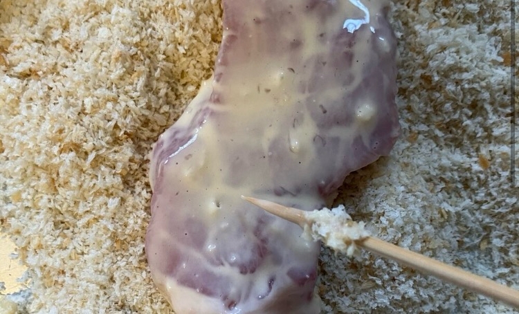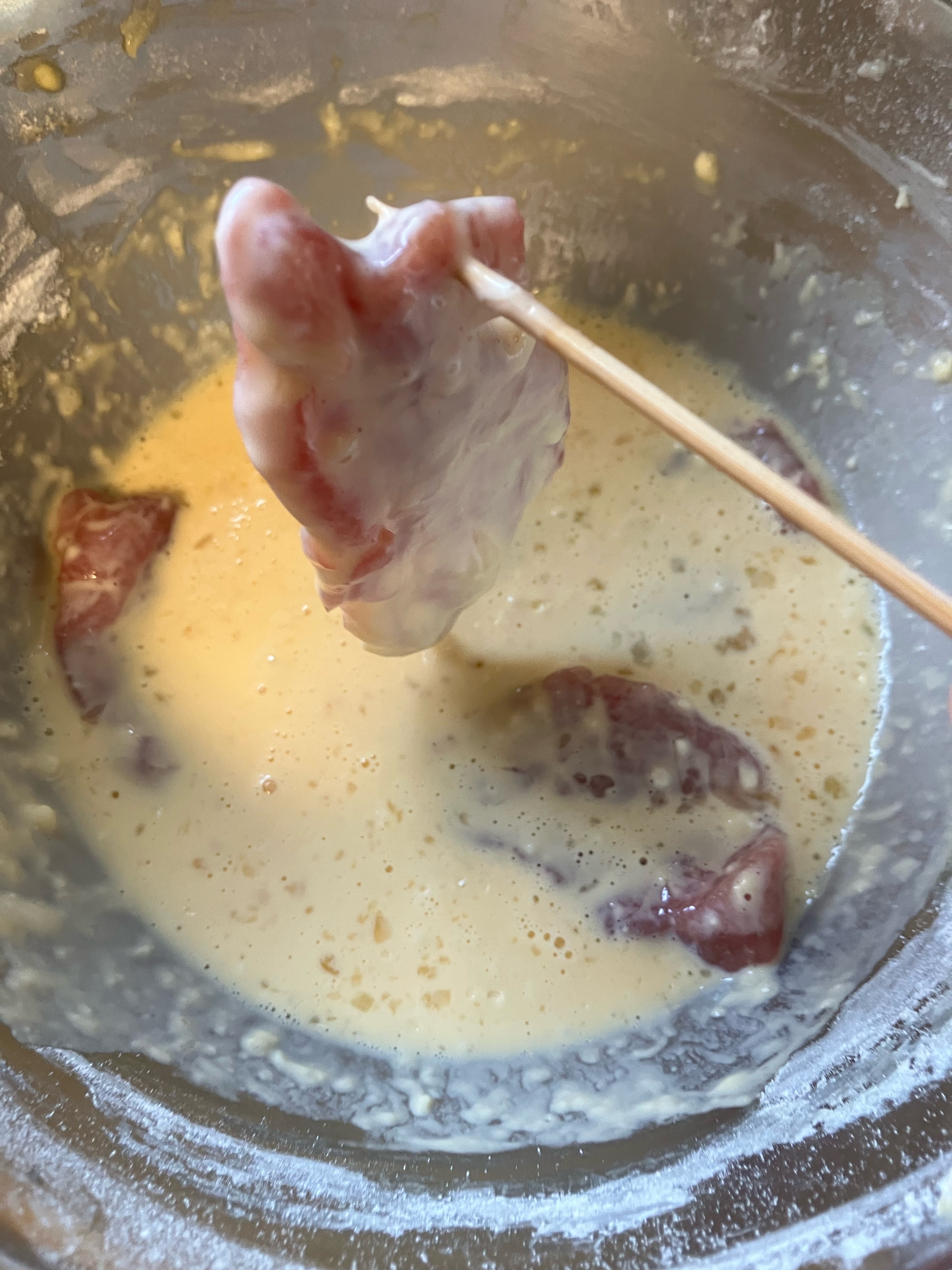 竹串で①の全体に穴を開けるように刺す。竹串を使い、バッター液に潜らせ余分なバッター液を落として、もう一度バッター液に潜らせ余分なバッター液を落とす。
